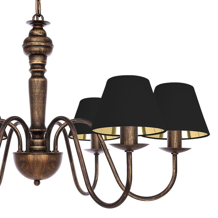 Żyrandol czarno-złoty do eleganckiego salonu GOLDSUN z sześcioma ramionami i czarnymi abażurami ze złotym wnętrzem to elegancki wybór do wnętrz w stylu glamour lub klasycznym. Materiałowe klosze z połyskującym środkiem odbijają światło w ciepły, nastrojowy sposób. Postarzany stelaż w czerni ze złotymi akcentami podkreśla szyk i charakter lampy. Doskonała do salonu, jadalni lub eleganckiej sypialni.