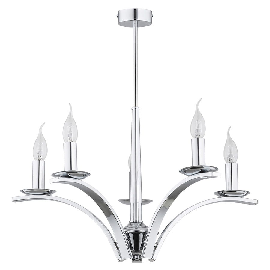 5-płomienny chromowany żyrandol świecznikowy do salonu lub jadalni. Chromowana, prosta konstrukcja stelaża nadaje lampie nowoczesny charakter.