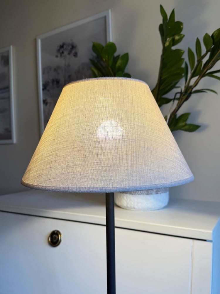 Abażur wykonany z tkaniny certyfikowanej podklejonej fabrycznie cieniutką pleksi dla sztywności, wykończony lamówką. Abażur dodatkowo jest zszywany co gwarantuje jego trwałość.