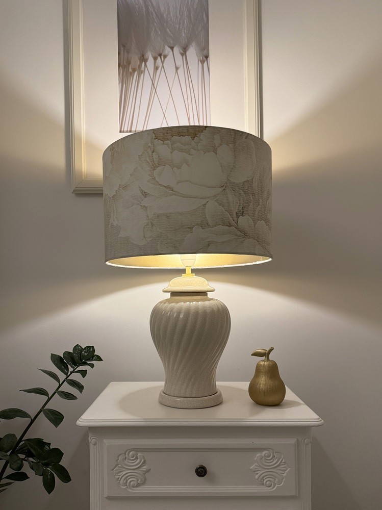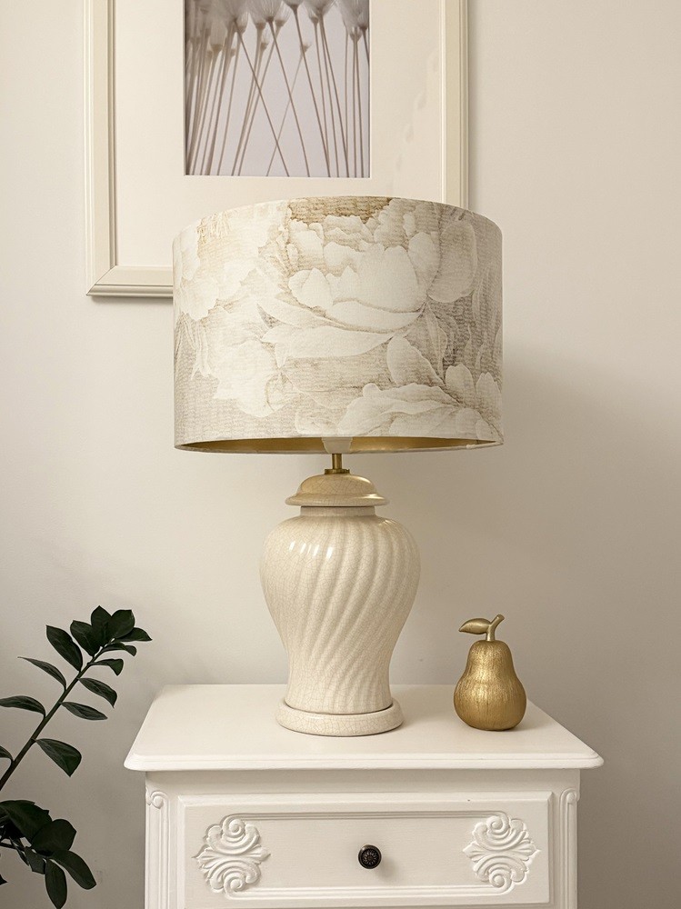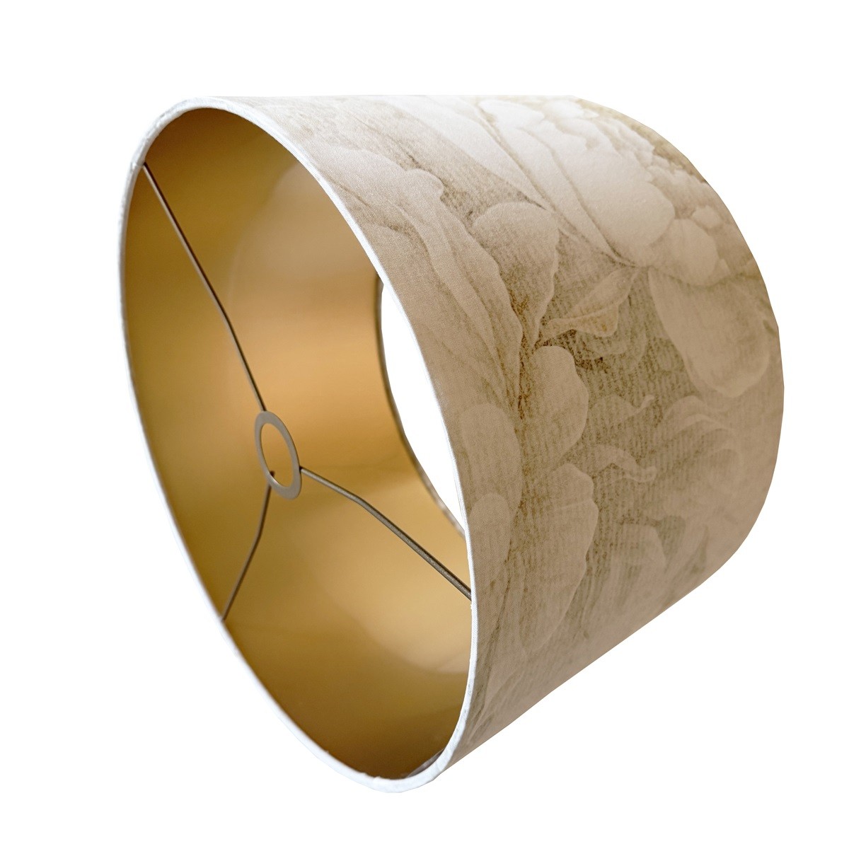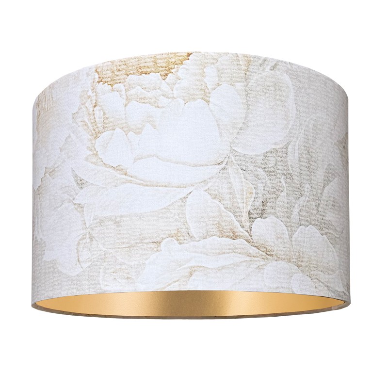 Abażur walec 40 cm do lampy podłogowej lub stojącej. Ten oryginalny abażur jest dostępny wyłącznie w naszym sklepie, ręcznie robiony z najwyższej jakości importowanej tkaniny. Przepiękny wzór dużych kwiatów peoni w jasnych kolorach beżów prezentuje się niezwykle zjawiskowo, a środek w kolorze szampańskiego złota nie tylko daje efekt luksusu ale też ociepla światło, dodając wnętrzu przytulności. Produkt w całości wykonany ręcznie.