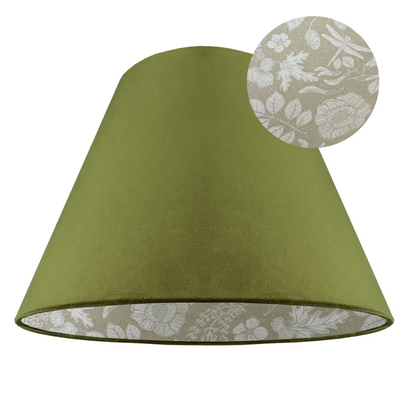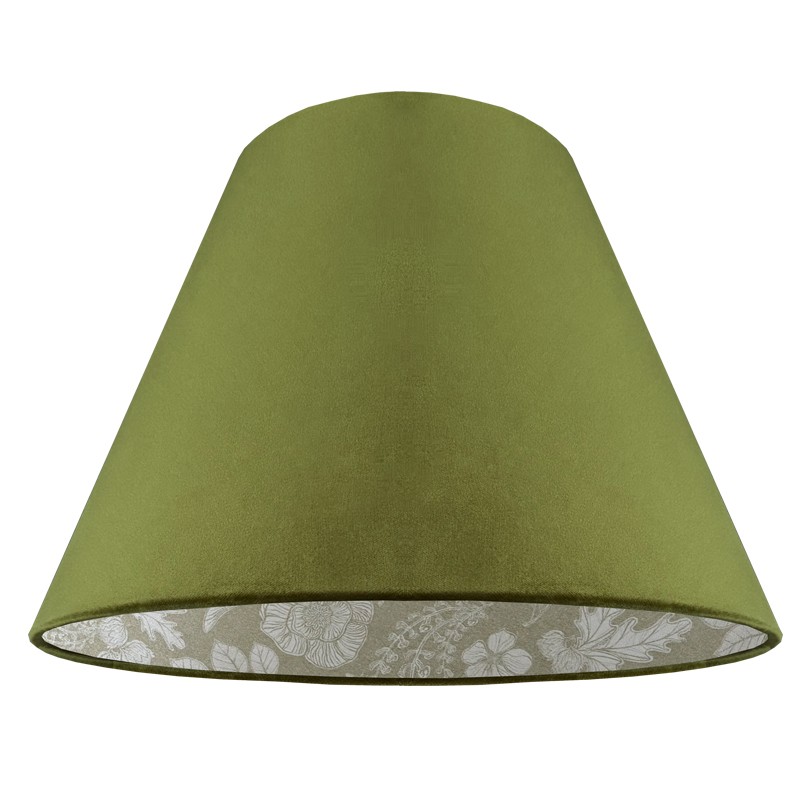 Abażur do lampy oliwkowy w kształcie stożka wykonany z pięknego, delikatnego weluru. Wyjątkowym elementem tego zielonego abażura jest jego nieoczywiste wnętrze, które zostało pokryte bawełnianą lekko zielonkawą tkaniną we wzory kwiatowe. Całość tworzy niezwykle oryginalny, niepowtarzalny efekt. Abażur idealny do lamp stojących, podłogowych oraz dużych lamp stołowych, wzbogaci swoim wyglądem każde wnętrze.