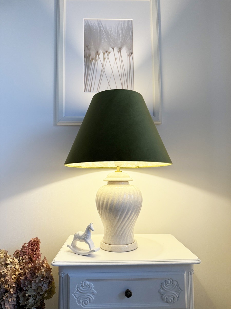 Ten zielony klosz po zapaleniu lampy tworzy miękkie, nastrojowe światło. Na szczególną uwagę zasługuje fakt, iż abażur został w całości wyprodukowany ręcznie w naszej pracowni.