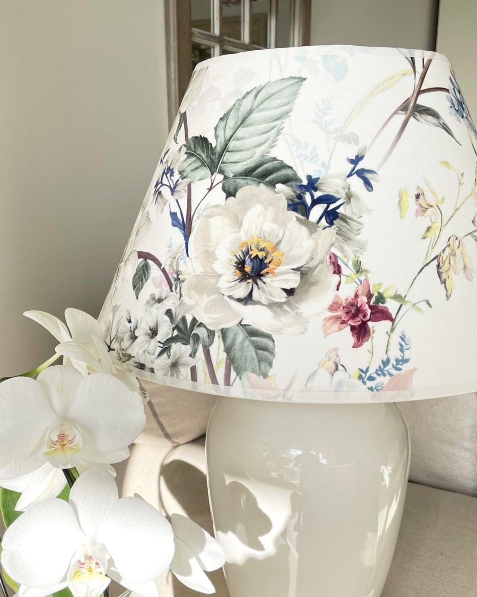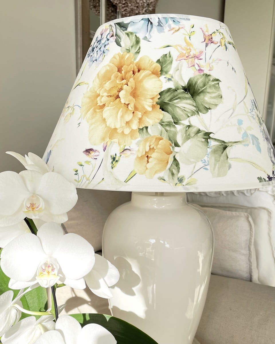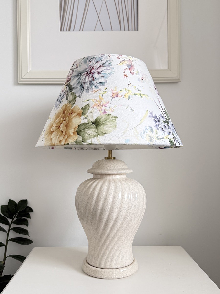 Abażur w kształcie stożka do lampy podłogowej lub lampy stołowej z mocowaniem na oprawkę E27, pięknie wykonany z DELIKATNEGO WELURU podklejonego cieniutką białą pleksi. Przepiękny delikatny kwiatowy wzór zwraca uwagę i stwarza romantyczny nastrój we wnętrzu. Abażur doskonale wpisze się w klimat klasycznych i prowansalskich wnętrz, nadając im szyku i przytulności.