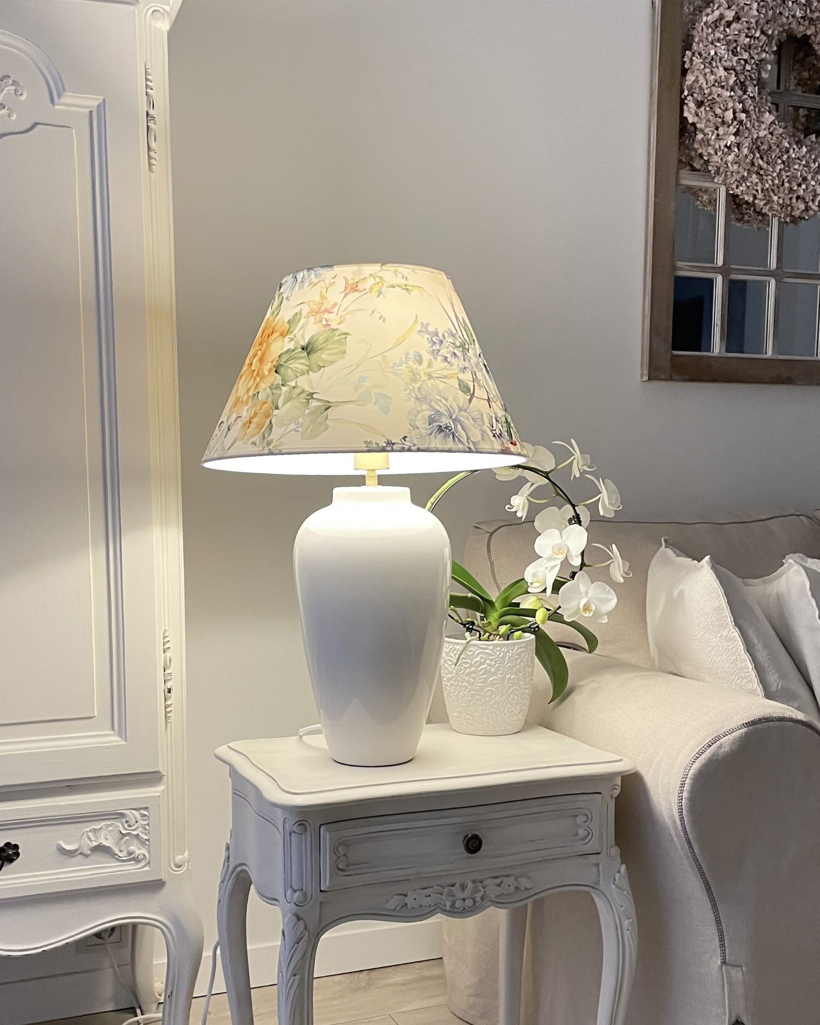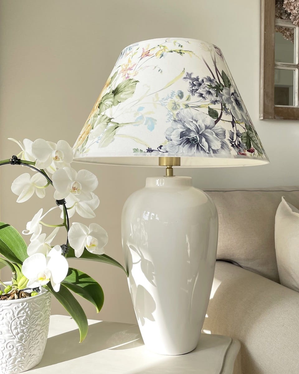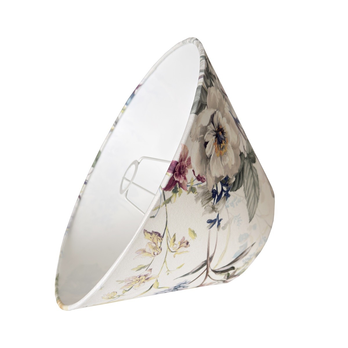 Abażur w kształcie stożka do lampy podłogowej lub lampy stołowej z mocowaniem na oprawkę E27, pięknie wykonany z DELIKATNEGO WELURU podklejonego cieniutką białą pleksi. Przepiękny delikatny kwiatowy wzór zwraca uwagę i stwarza romantyczny nastrój we wnętrzu. Abażur doskonale wpisze się w klimat klasycznych i prowansalskich wnętrz, nadając im szyku i przytulności.