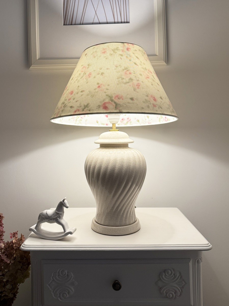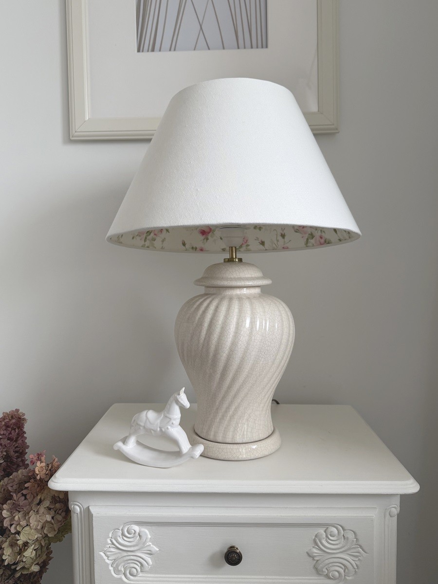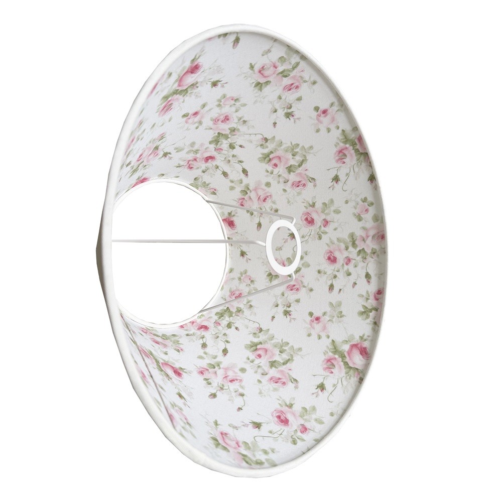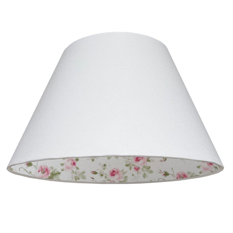 Abażur do lampy stożek biały 40 cm. Przepiękna biała tkanina i delikatne różyczki od wewnątrz, to cechy charakterystyczne dla tego abażura. Dodatkowo po zapaleniu światła dzieje się coś magicznego, różyczki stają się widoczne również na zewnątrz. Abażur pasuje do standardowego mocowania na oprawkę żarówki E27 do lamp stołowych oraz do lamp podłogowych. Jeśli znudziły Ci się zwyczajne, jednokolorowe abażury ten dizajnerski abażur z pewnością przypadnie Ci do gustu. Nie bez znaczenia jest też fakt, iż abażur w całości został wykonany ręcznie, z wysokiej jakości tkanin.