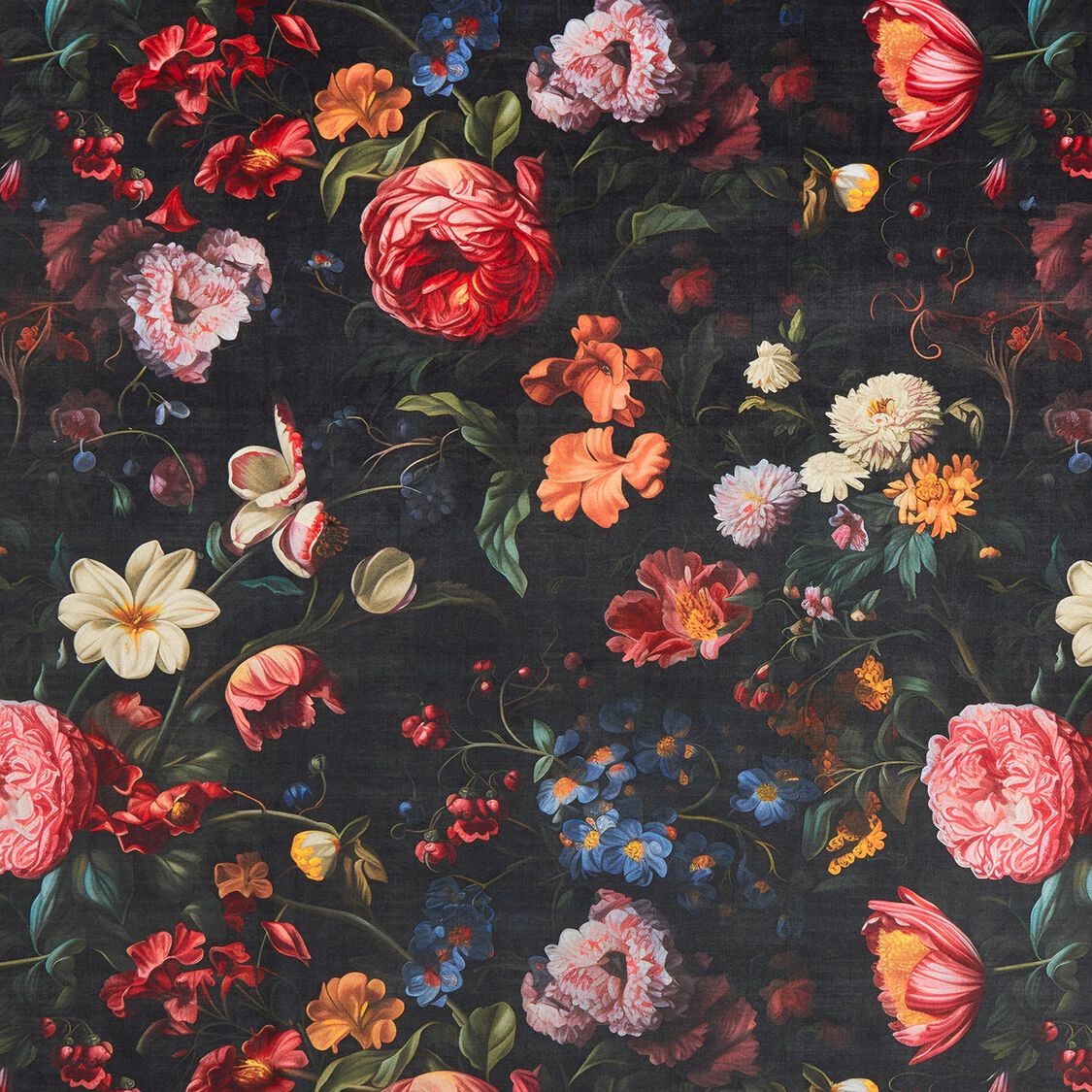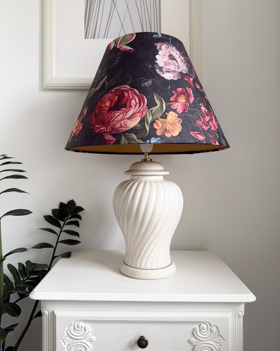 Abażur wykonano z wysokiej jakości aksamitu w głębokim kolorze antracytu. Ciemne tło podkreślaja intensywne kolory kwiatowego wzoru. Aksamit dodaje wnętrzu elegancji oraz stylu.
