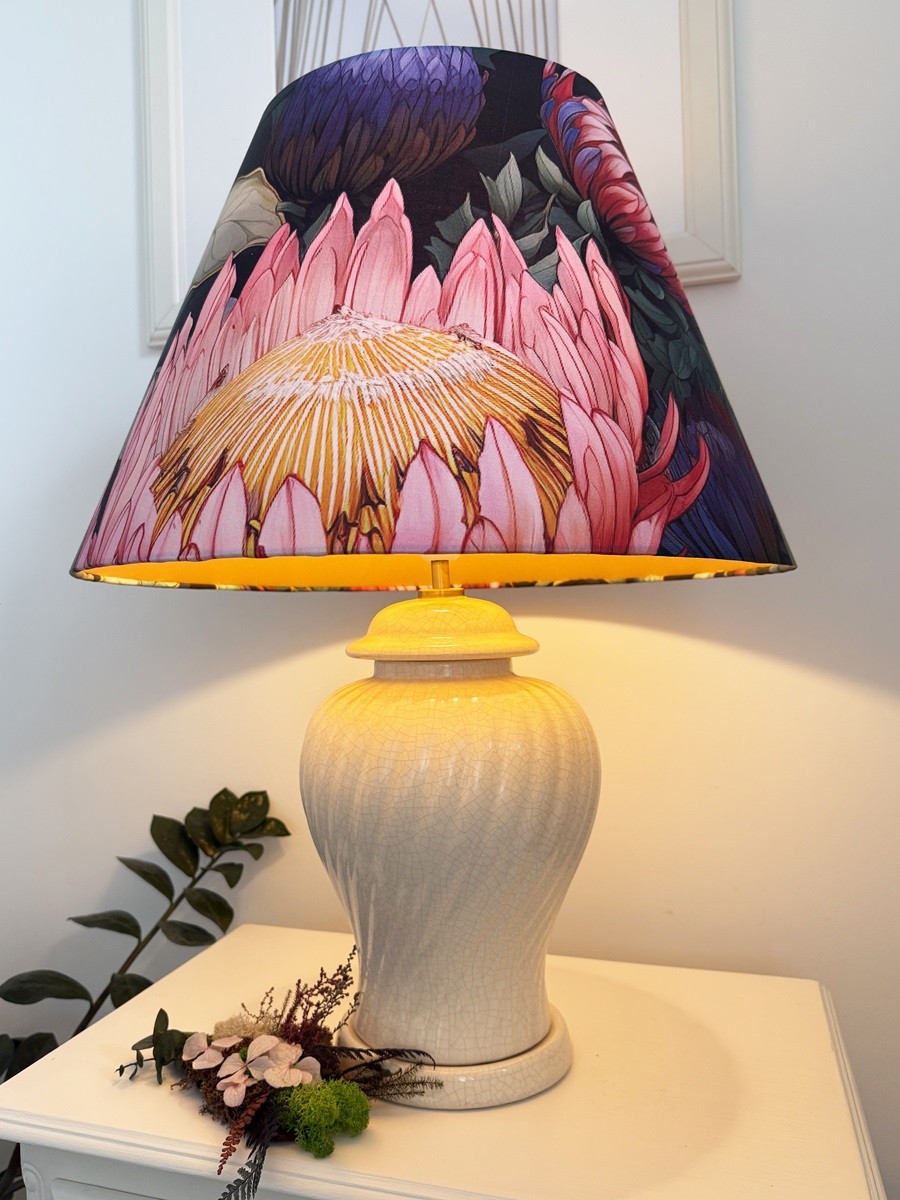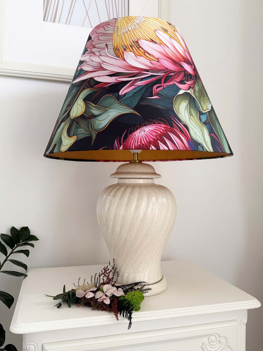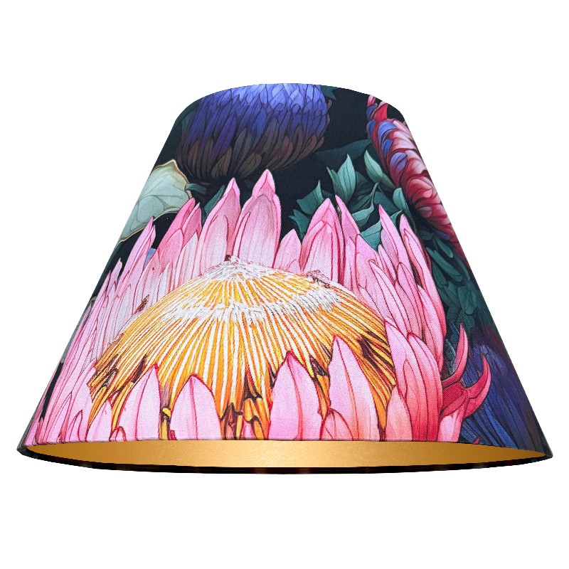 Abażur do lampy w duże kwiaty srebrnika ze złotym, półmatowym wnętrzem. Wyjątkowy produkt, ręcznie wykonany z dbałością o detale. Abażur w jakości premium dostępny wyłącznie w naszych sklepach, powstał z pasji do pięknych wnętrz. Czarne tło, a na nim różowe, fioletowe i niebieskie kwiaty, przepięknie prezentuje się w wyjątkowych wnętrzach, pasuje do wielu kolorów z akcentami złota. Wnosi do wnętrza styl, elegancję i ciepłe, złote światło.