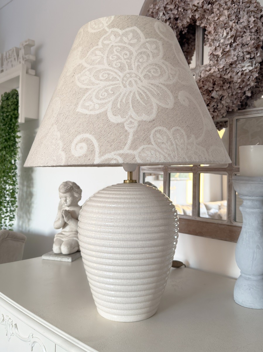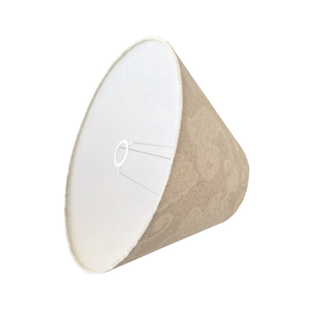 Abażur do lampy z lnu z kwiatowym wzorem idealny do lampy podłogowej lub dużej lampy stołowej wykonany z tkaniny z przepięknym wzorem kremowych kwiatów. Delikatne kolory beżu sprawiają, że abażur pasuje do wielu aranżacji wnętrz od skandynawskich, przez boho, po prowansalskie.