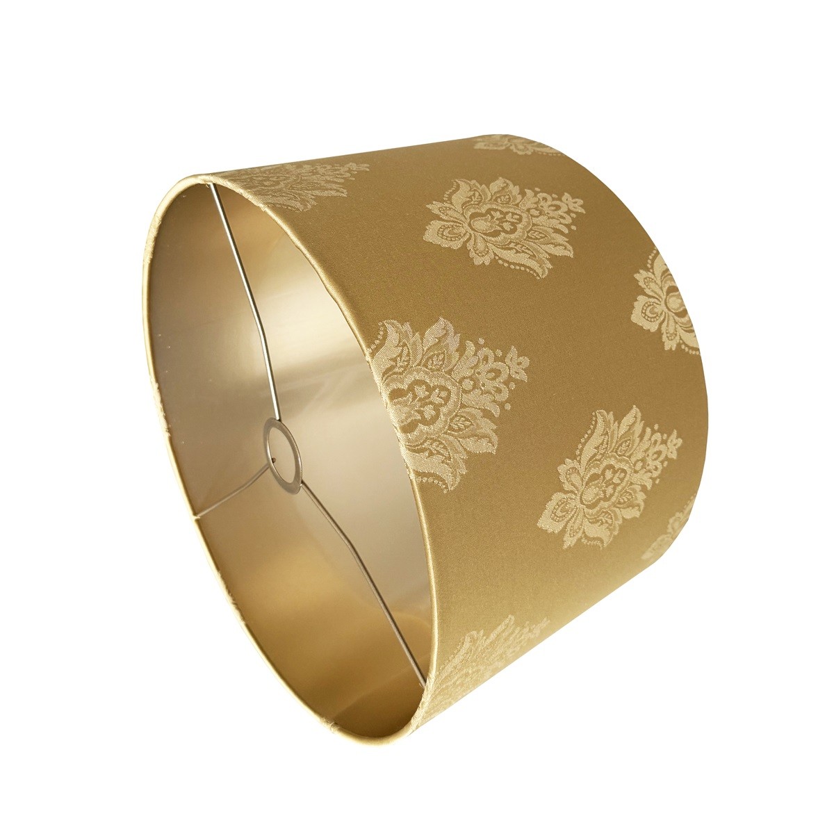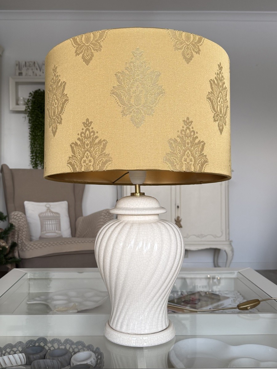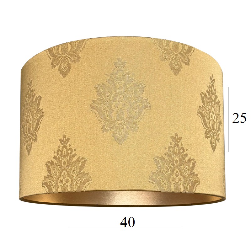 Piękna, połyskująca tkanina z wzorem adamaszkowym, to szczyt elegancji, nawiązuje do dawnych pałacowych tekstyliów. Przepięknie się mieni, w zależności od kąta padania światła. Ten złoty abażur to klasyka, która nie ulega przelotnym trendom i nie wychodzi z mody.