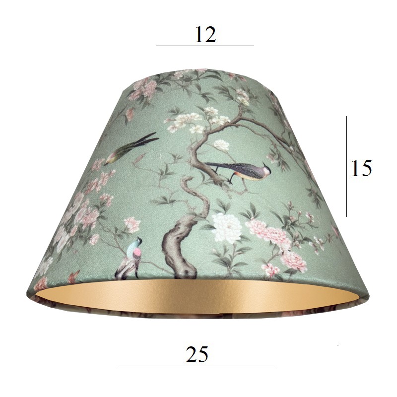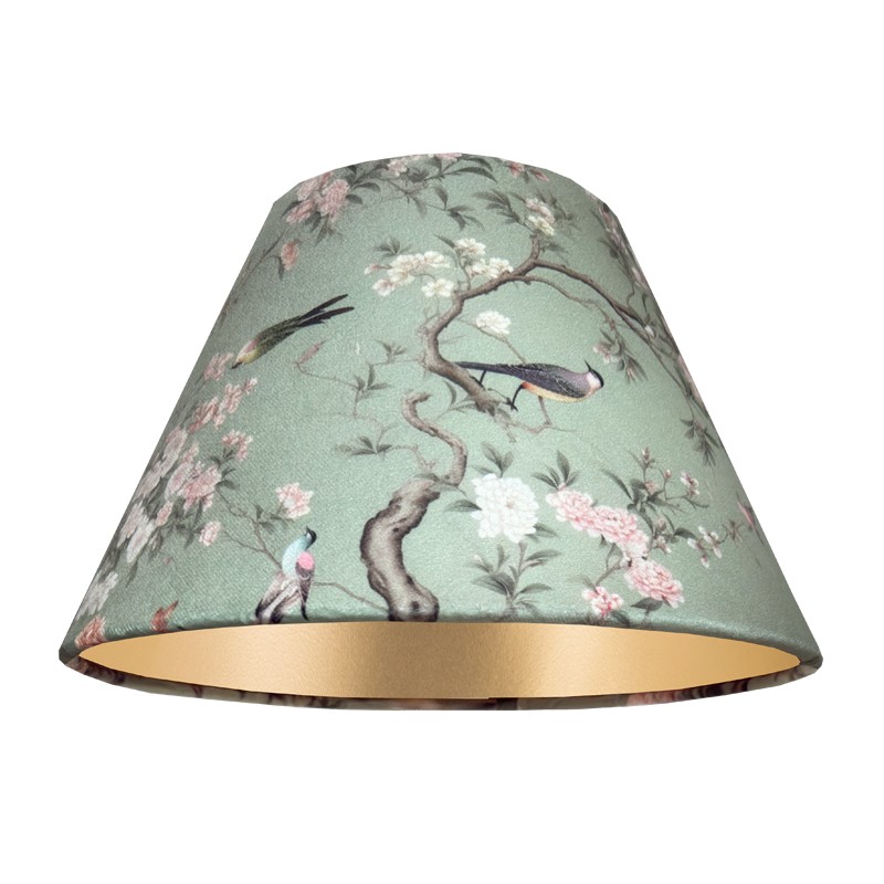 Abażur stożek 25cm do lampki nocnej z zielonej tkaniny, z motywem roślinnym. Przepiękna, welurowa tkanina w stylu japońskim, z gałązkami oraz różnokolorowymi ptaszkami, od spodu złota folia to idealne połączenie. Abażur pięknie prezentuje się w eleganckich, klasycznych lub angielskich wnętrzach, na tle jasnych lub brązowych elementów wyposażenia. Delikatna, welurowa tkanina dodaje abażurowi luksusu i elegancji. Abażur daje przyjemne, ciepłe i nastrojowe światło.