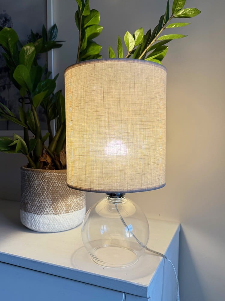 | MATERIAŁ | tkanina w kolorze 13 BEŻ LEN z lamówką w kolorze abażura, zapalona żarówka będzie widoczna przez abażur |