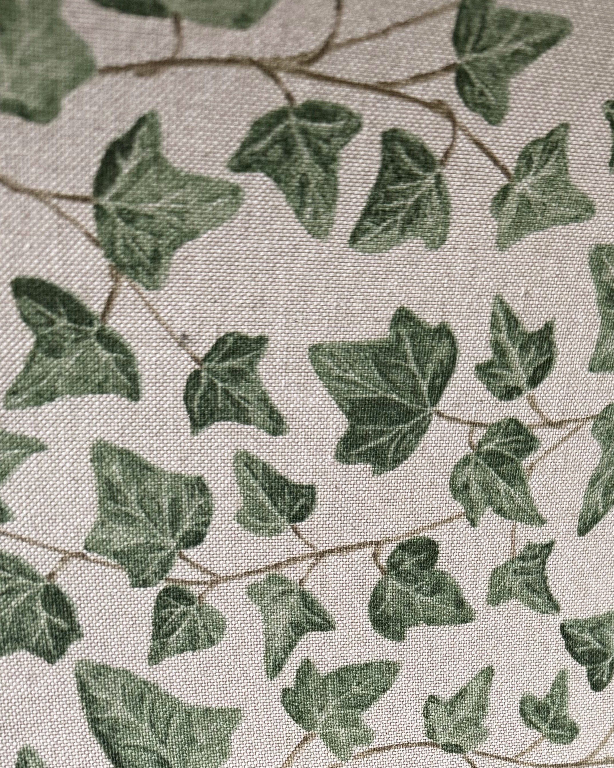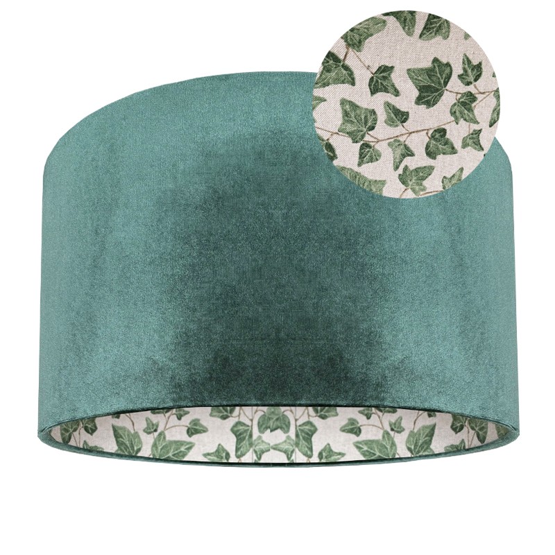 Wnętrze abażura to dekoracyjna tkanina przedstawiająca ciekawy wzór bluszczowych liści, które tworzą efekt przyjemnej głębi. Po zapaleniu lampy motyw roślinny delikatnie się rozświetla, wzmacniając efekt. Ten roślinny motyw nadaje abażurowi niepowtarzalnego charakteru i sprawia, że staje się on również dekoracyjnym akcentem we wnętrzu.