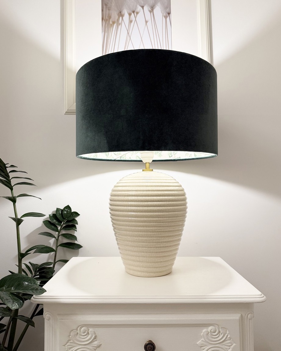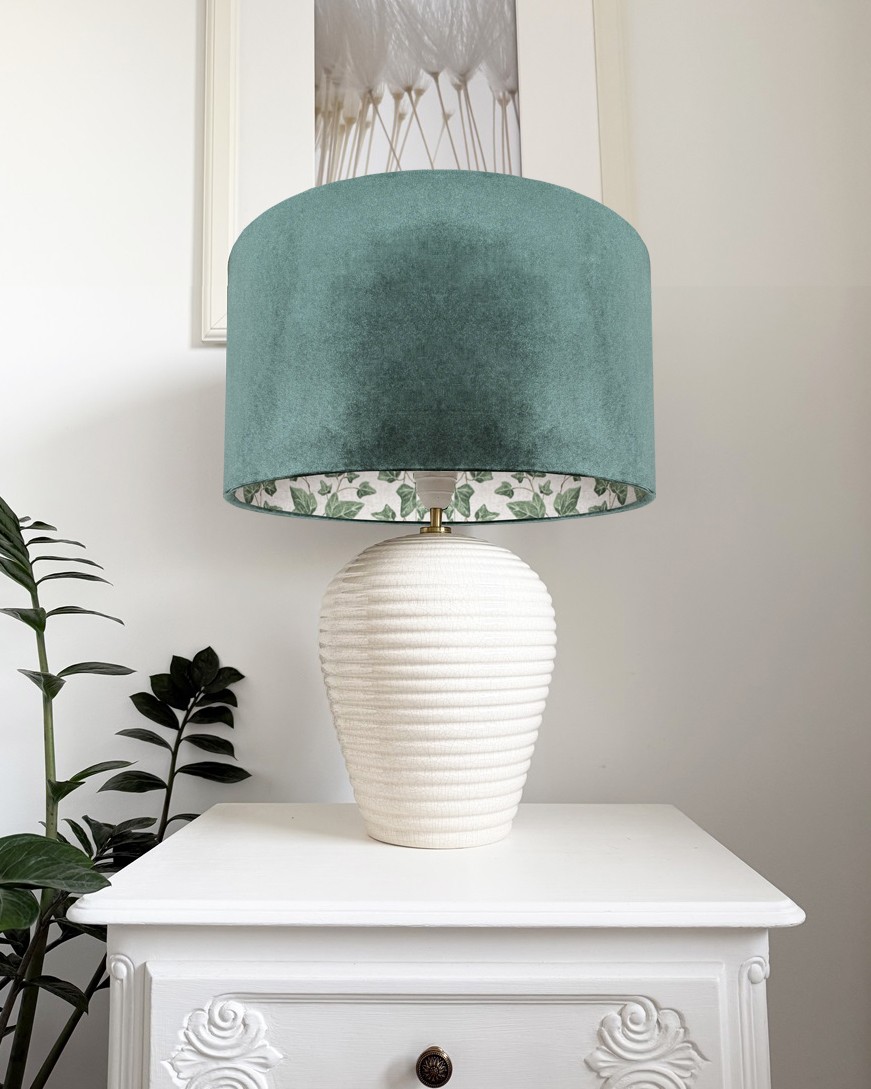 Ten stylowy abażur do lampy wnosi do wnętrza wyjątkową elegancję dzięki połączeniu przepięknej tkaniny aksamitnej z naturalnym motywem roślinnym. Z zewnątrz klosz otula miękki, lekko połyskujący zielony aksamit, który subtelnie odbija światło i nadaje całości wyrafinowanego charakteru. Aksamitna powierzchnia sprawia, że abażur prezentuje się luksusowo, a jednocześnie naturalnie komponuje się z różnymi stylami aranżacyjnymi od skandynawskich, przez eko, aż po nowoczesne aranżacje.