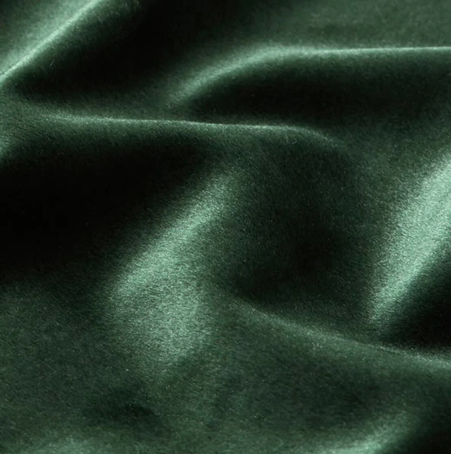 | MATERIAŁ | Na zewnątrz zielony aksamit z połyskiem, od spodu lniana tkanina beżowa z liśćmi bluszczu, naklejona na pleksi |