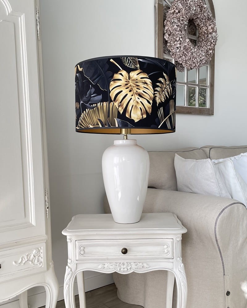 Abażur walec do lampy czarno-złoty z motywem roślinnym. Abażur pasuje do lampy podłogowej, stołowej lub do lampy wiszącej z mocowaniem na oprawkę E27, pięknie wykonany z przyjemnego w dotyku WELURU podklejonego cieniutką złotą pleksi. Przepiękny złoty wzór zwraca uwagę i dodaje wnętrzu elegancji i stylu. Abażur doskonale wpisze się w klimat klasycznych wnętrz, nadając im szyku i przytulności.