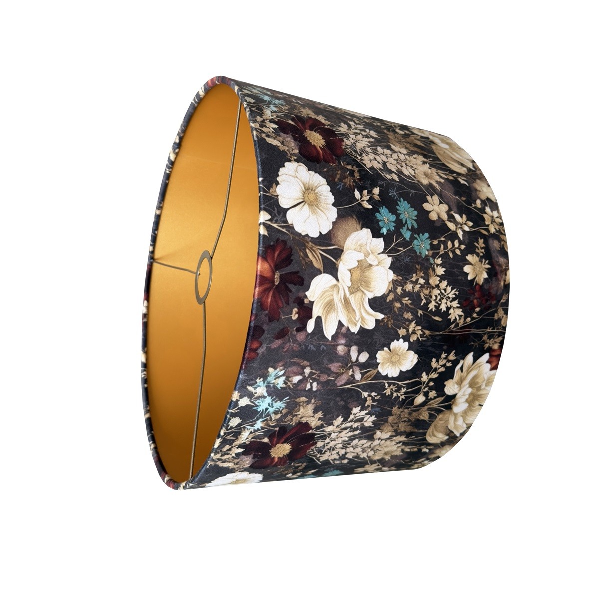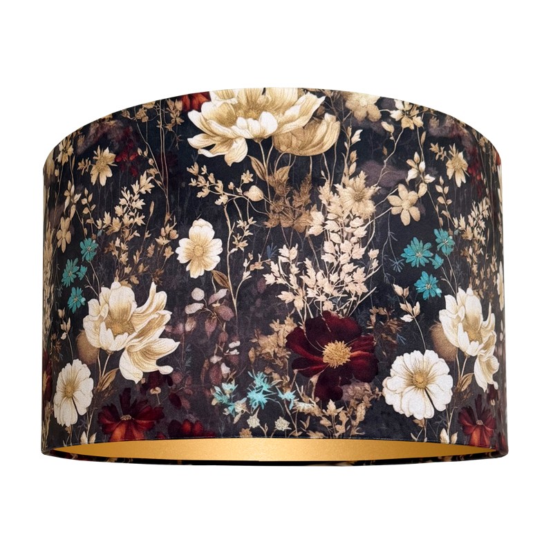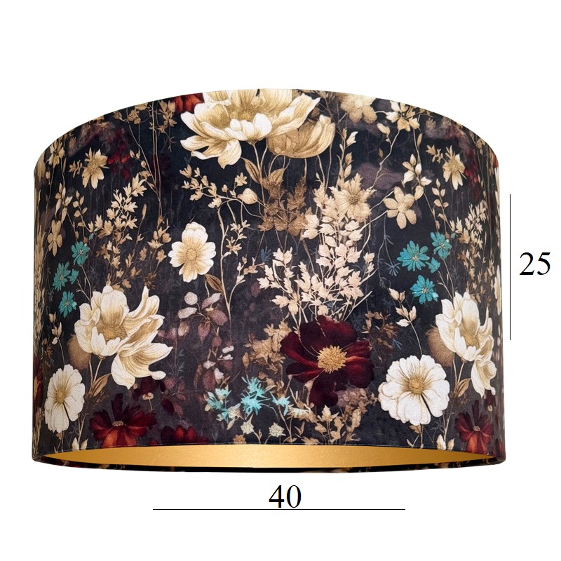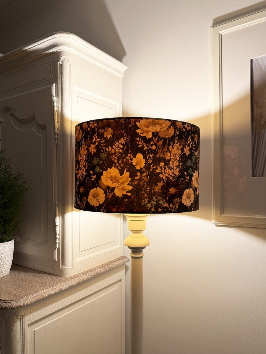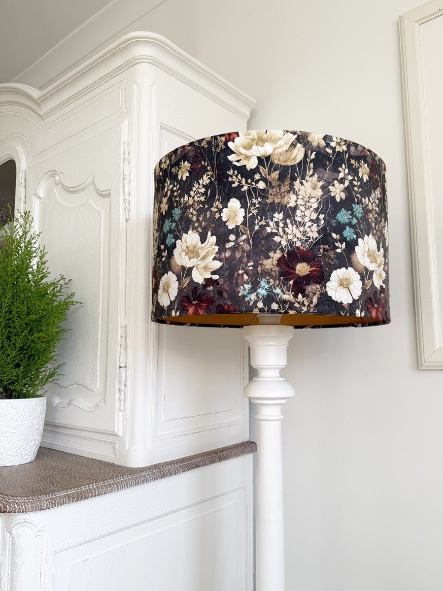Abażur walec do lampy stojące z wzorzystego aksamitu. Abażur pasuje do lampy podłogowej lub stołowej z mocowaniem na oprawkę E27, pięknie wykonany z przyjemnego w dotyku WELURU w kolorze antracytowym, podklejonego cieniutką złotą pleksi. Przepiękny kwiatowy wzór zwraca uwagę i dodaje wnętrzu elegancji i stylu. Abażur doskonale wpisze się w klimat klasycznych wnętrz, nadając im szyku i przytulności.