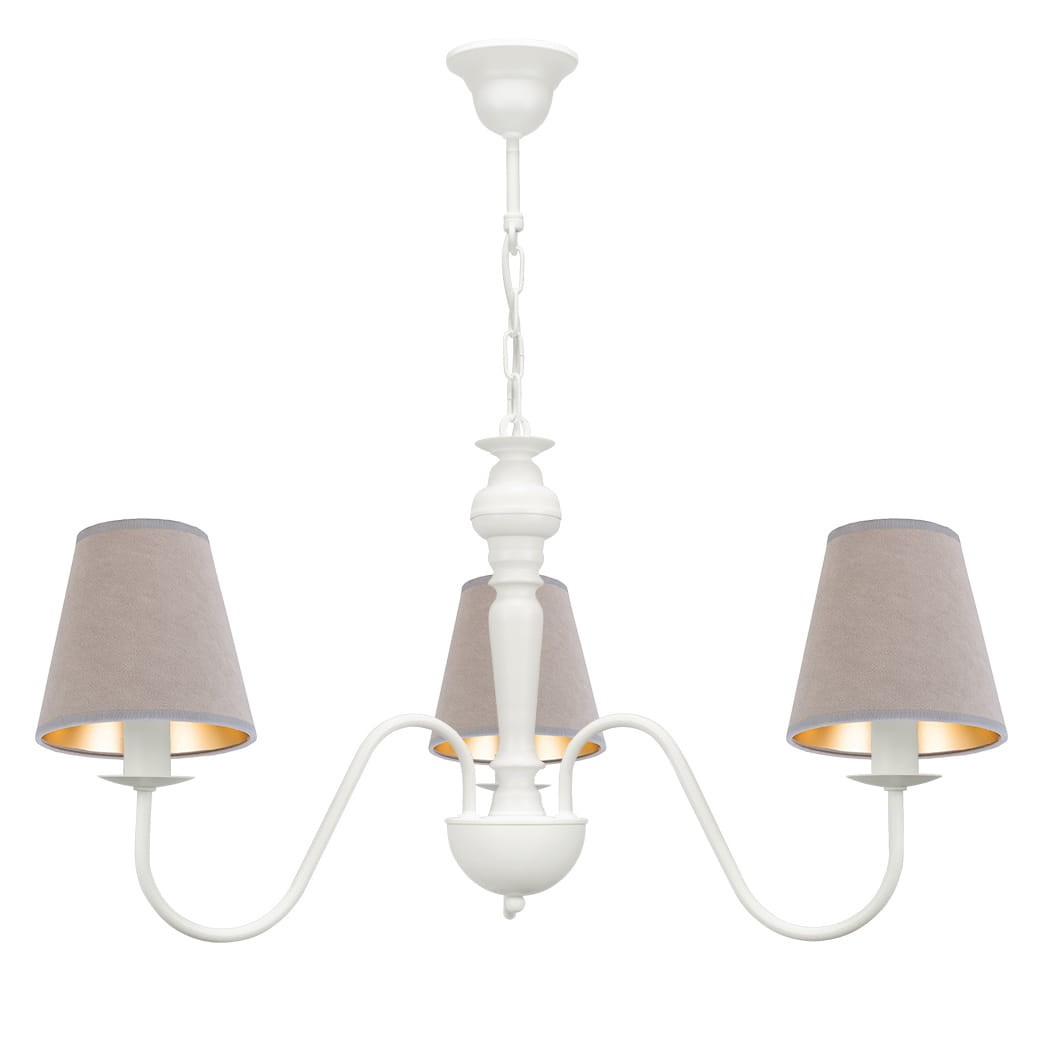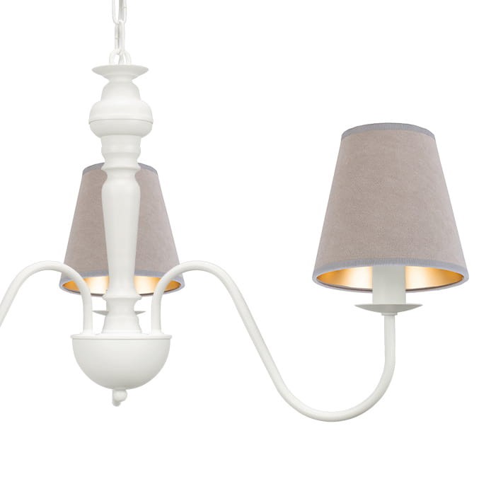 Biała elegancka lampa sufitowa GOLDSUN z trzema ramionami i abażurami z beżowego weluru to stylowa propozycja do klasycznych, jasnych wnętrz. Biały, metalowy stelaż dodaje lekkości, a miękka struktura weluru i jego ciepły odcień tworzą przytulną atmosferę. Subtelna kolorystyka i elegancka forma sprawiają, że żyrandol doskonale sprawdzi się w sypialni, salonie lub przedpokoju, wprowadzając do wnętrza miękkie, nastrojowe światło.