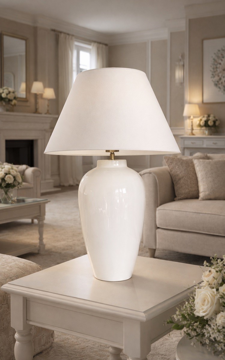 Biała lampa ceramiczna na komodę z piękną, smukłą podstawą wykonaną z gładkiej, ceramiki oraz abażurem wykonanym z tkaniny w kolorze białym. Całość tworzy klasyczną, elegancką oprawę oświetleniową, która pełni nie tylko funkcję oświetleniową ale jest przede wszystkim stylowym dodatkiem do każdego wyjątkowego wnętrza. Ta biała lampa ceramiczna wspaniale prezentuje się na tle zarówno klasycznych jak i nowoczesnych wnętrz, nadaje im niepowtarzalnego stylu i klasy. Lampa z ceramiki w jakości premium.