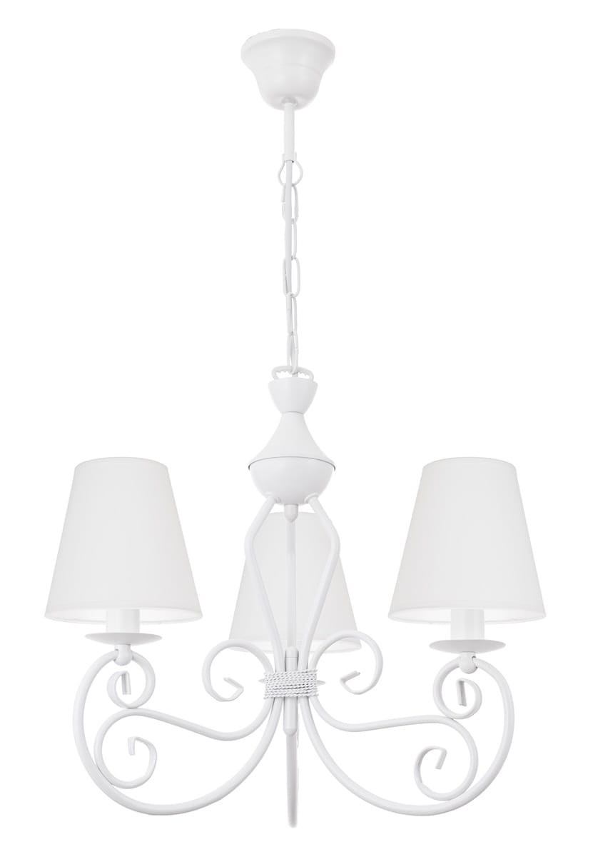 Biała lampa do pokoju DALIA 3-płomienny, to piękny, ponadczasowy model dedykowany do klasycznych wnętrz. Żyrandol o pięknych ramionach składających się z finezyjnie wygiętych rureczek, które zostały wykończone uniwersalnymi, białymi abażurkami. Dla lepszego dopasowania lampy do swojego wnętrza można zmienić tkaninę abażurów na dowolną z palety poniżej.