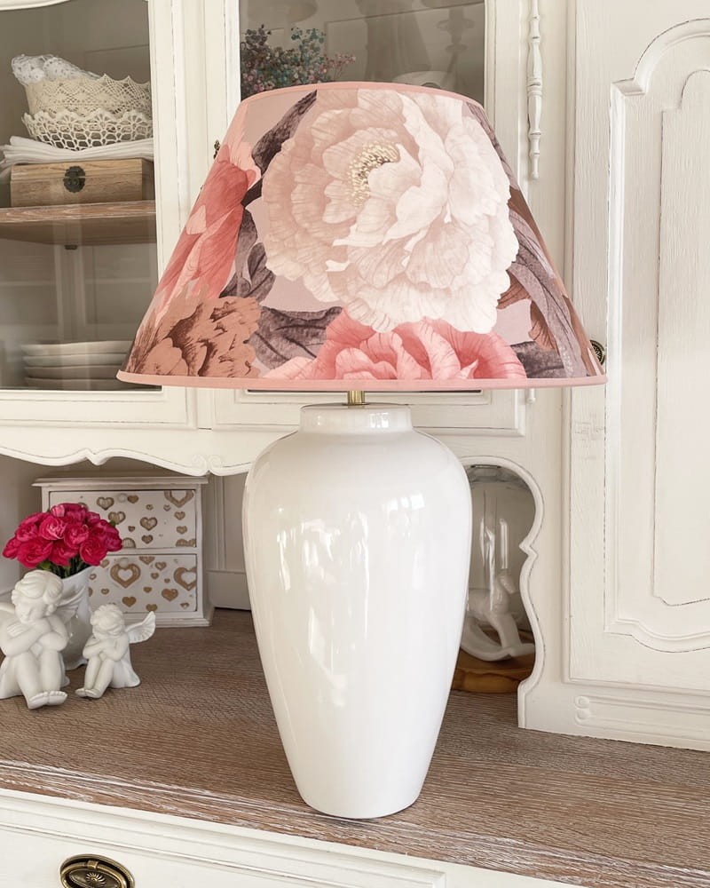 | Materiał | Podstawa lampy: ceramika w kolorze BIAŁYM JEDNOLITYM, metalowa oprawka żarówki w kolorze złotym z możliwością regulacji nachylenia abażura. Abażur w kolorze PIWONIE WELUR - kwiaty piwonii w kolorach ecru, różowym oraz brązowym od spodu biały, tkanina WELU |