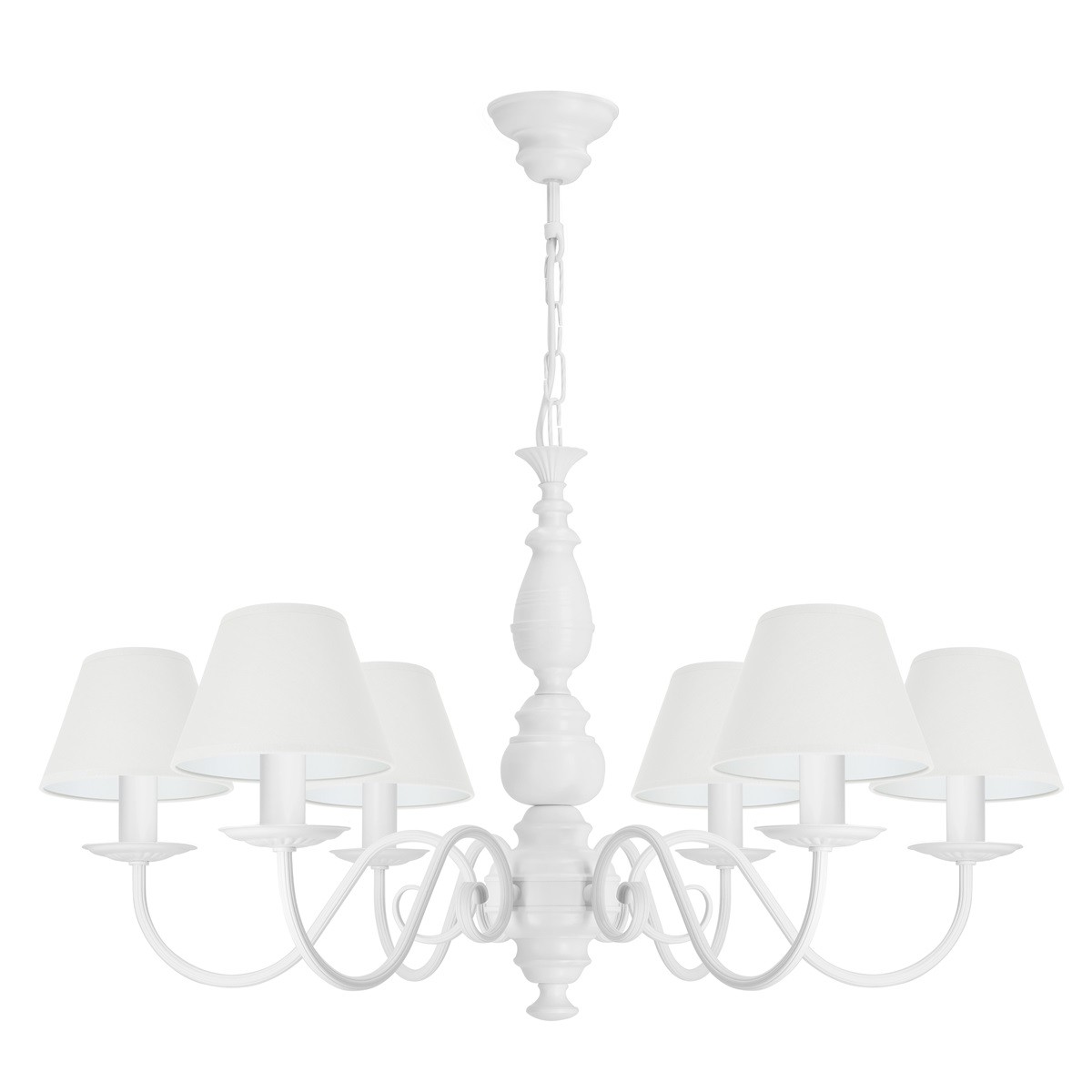 Biała lampa sufitowa klasyczna z abażurami do salonu, sypialni lub przestronnej jadalni. Piękny, elegancki stelaż w kolorze białym, perfekcyjnie wykonany i zaprojektowany został wykończony białymi, zgrabnymi abażurkami. Jeśli do Twojego pomieszczenia będą pasowały abażury w innym kolorze istnieje możliwość zmiany tkaniny na dowolną z palety poniżej.