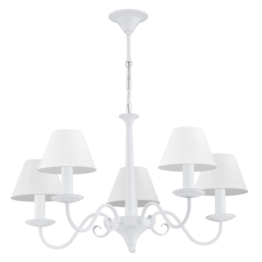 Biała lampa sufitowa z abażurami z wysokiej jakości tkaniny. Żyrandol dopełni wnętrze salonu urządzonego w stylu klasycznym lub prowansalskim.