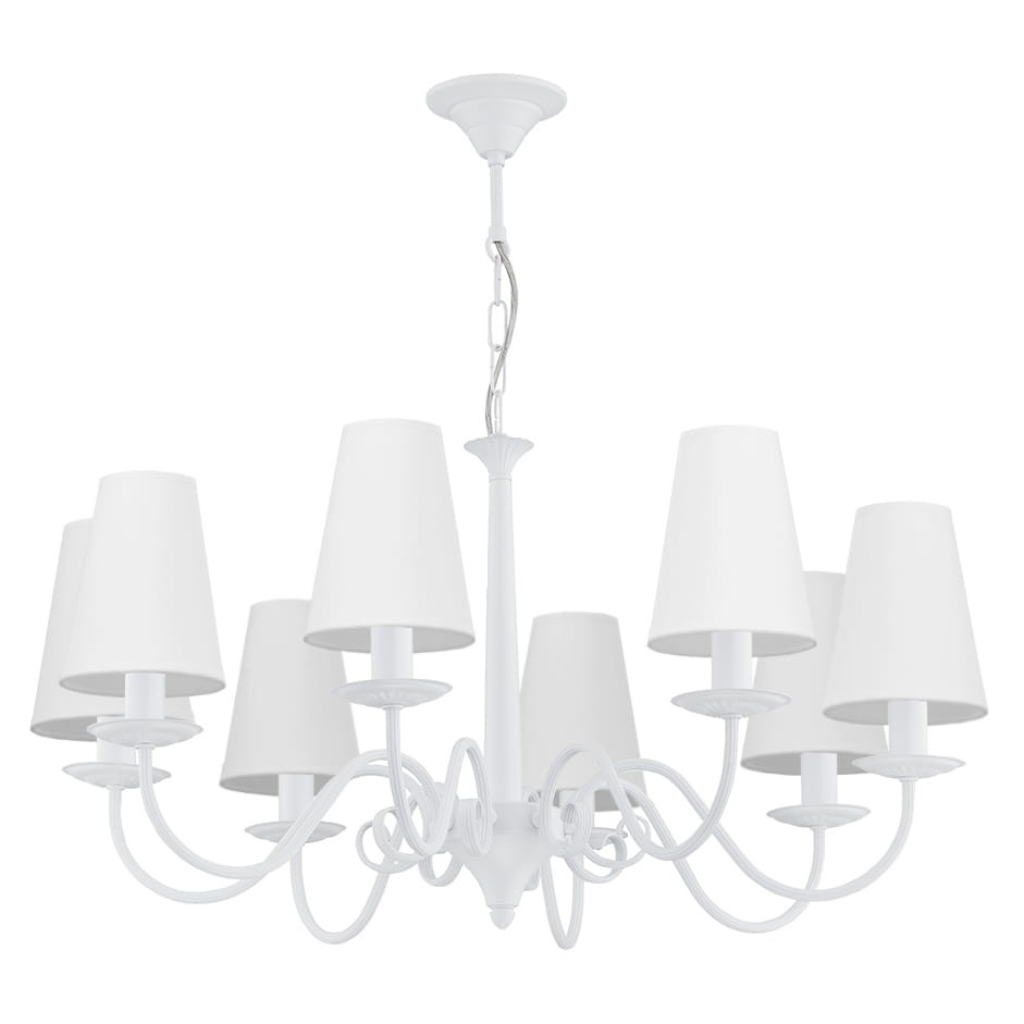Biała lampa wisząca 8-ramienna z rodziny ASTOR. Model polskiego producenta został uzupełniony białymi abażurkami.