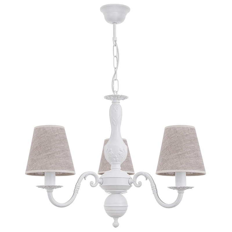 Biała lampa wisząca do sypialni, subtelna w formie, pięknie wykonana. Żyrandol 3-ramienny doskonały do mniejszych pomieszczeń, połączenie bieli i lnianych abażurków doskonale komponuje się z wystrojem prowansalskim, angielskim czy klasycznym, świetnie wygląda na tle stylizowanych jasnych mebli, ozdobnej sztukaterii, naturalnych tkanin i dodatków. Produkt polski, najwyższej jakości.