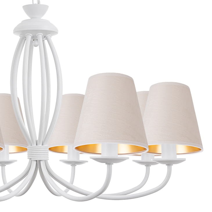 Biała lampa z welurowymi abażurami OLIVER to elegancka lampa sufitowa z ośmioma ramionami, zaprojektowana z myślą o przestronnych, jasnych wnętrzach. Biały stelaż doskonale komponuje się z abażurami z białego weluru, których złote wnętrze ociepla światło i dodaje całości przytulnego charakteru. To klasyczny model, który świetnie sprawdzi się w dużym salonie, jadalni lub sypialni, podkreślając styl i elegancję pomieszczenia.