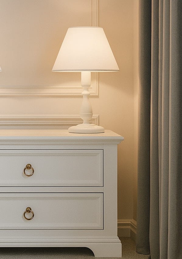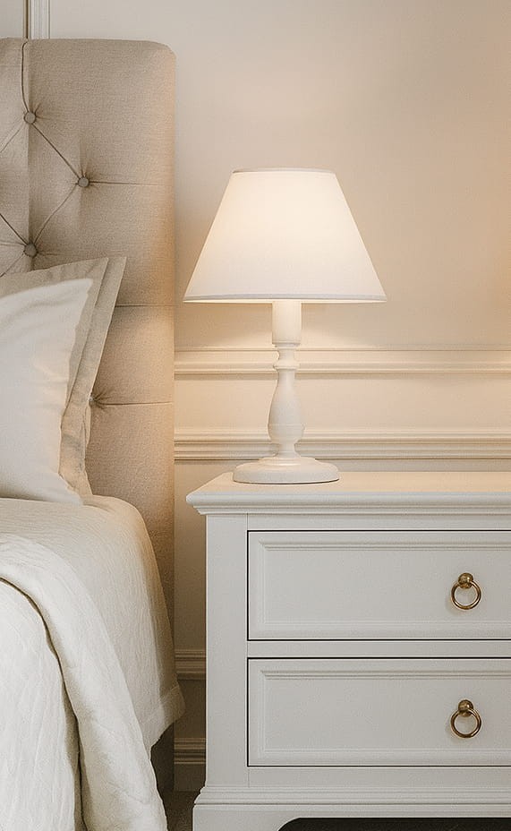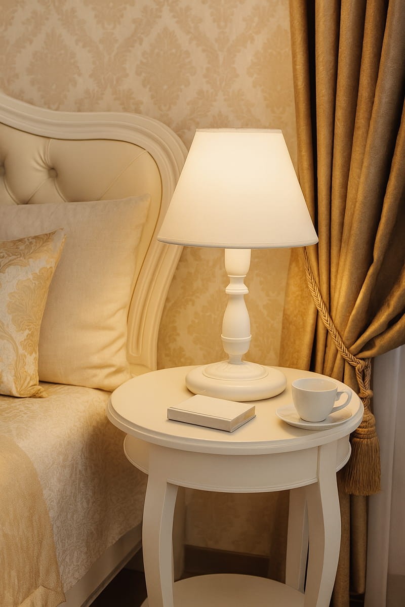 Urocza biała lampka nocna prowansalska JULIA. Delikatna lampka z abażurem z tkaniny o klasycznym i ponadczasowym kształcie. Lampka na oryginalnej metalowej podstawie będzie znakomicie prezentować się w romantycznej sypialni utrzymanej w modnej prowansalskiej czy angielskiej stylistyce. W połączeniu z jasnymi meblami i pastelowymi dodatkami lampka nocna JULIA doda wnętrzu blasku i niepowtarzalnego uroku. Lampkę JULIA mogą Państwo zamówić z abażurem w dowolnej tkaninie z wzornika poniżej, aby jak najlepiej dopasować ją do wnętrza.