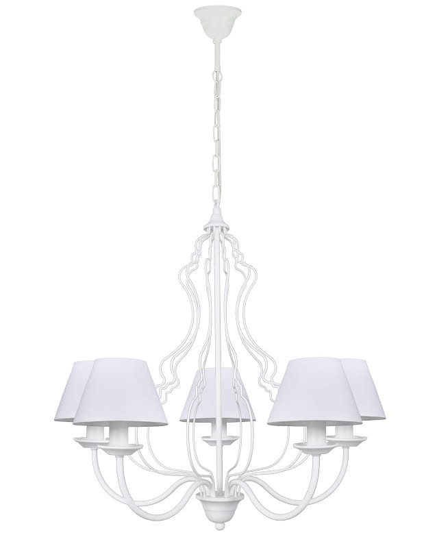 Biała stylowa lampa do sypialni. Wyjątkowo elegancka i subtelna biała lampa z abażurami z wysokiej jakości tkaniny. Żyrandol 5-ramienny zwraca uwagę delikatną formą, doda wnętrzu lekkości i wdzięku, wspaniale pasuje do aranżacji w stylu prowansalskim, angielskim czy shabby chic. Prezentowany model pięknie prezentuje się w pomieszczeniach urządzonych w jasnych kolorach, z delikatnymi dodatkami, naturalnymi materiałami.
