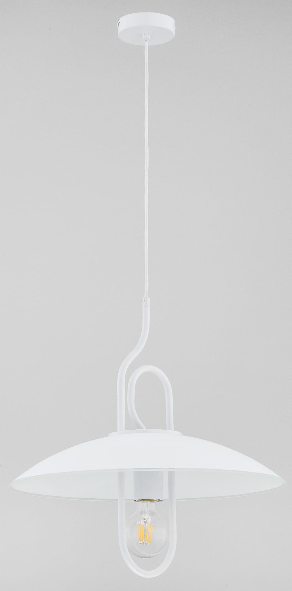 Biała unikatowa lampa z kloszem. Pojedyncza lampa wisząca w klasycznej bieli będzie świetnym dodatkiem oświetleniowym w jasnej kuchni. Oryginalnie wygięty stelaż z pewnością przyciągnie uwagę. Polski producent.