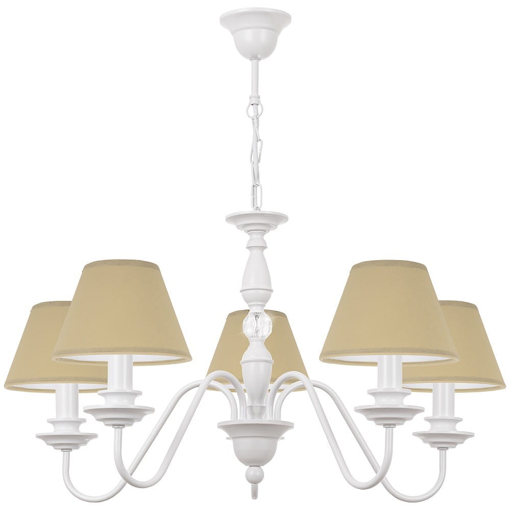Biało beżowy żyrandol KRISTAL. Duży stylowy biały żyrandol z beżowymi abażurkami. Rewelacyjnie wpasuje się w jasne pomieszczenia takie jak jadalnia, salon,czy sypialnia. Jego nieprzeciętny wygląd przyciągnie wzrok a dodatkowy element jakim jest przeźroczysty kryształ sprawi że lampa będzie pięknie błyszczeć i odbijać światło.