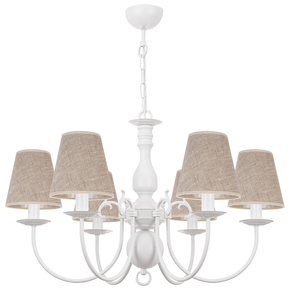 Biało-beżowy żyrandol do pokoju MARIA BIAŁA. Duży biały żyrandol z pięknymi tkaninowymi abażurami w kolorze beżowym będzie idealnym dopełnieniem jasnych wnętrz i mebli. Żyrandol wykonany w rustykalnym stylu zachwyca swoim nietuzinkowym wyglądem. Został w całości wyprodukowany w Polce co niewątpliwie jest jego dużą zaletą.