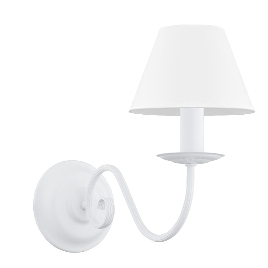 Biały kinkiet z abażurem z tkaniny. Pasuje do wnętrz eleganckich, klasycznych lub prowansalskich. Model będzie świetnym dopełnieniem sypialni lub pokoju dziennego.