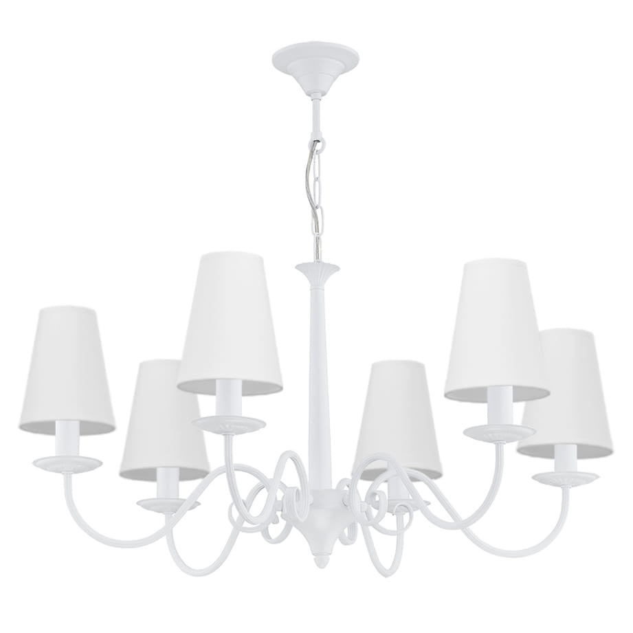 Biały klasyczny żyrandol z abażurami to model 6-ramienny, odpowiedni do przestronnego salonu. Biała kolorystyka nadaje całości bardzo subtelny charakter, dlatego lampa z łatwością wpisze się w większość aranżacji.