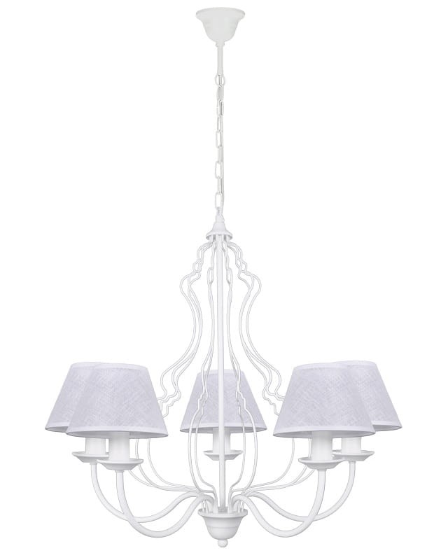 Biały stylowy żyrandol, wyjątkowo subtelny i delikatny. Zgrabne abażury zostały wykonane z lnianej tkaniny w białym kolorze, tkanina o rzadkim splocie jest półprzezroczysta sprawdzi się więc tam, gdzie potrzebują Państwo dużo światła. 5-ramienny żyrandol MARGO to nasza propozycja do wnętrz urządzonych w jasnych odcieniach, nawiązuje nieco do modnego stylu prowansalskiego czy shabby chic- bardzo efektownego i wciąż bardzo modnego.