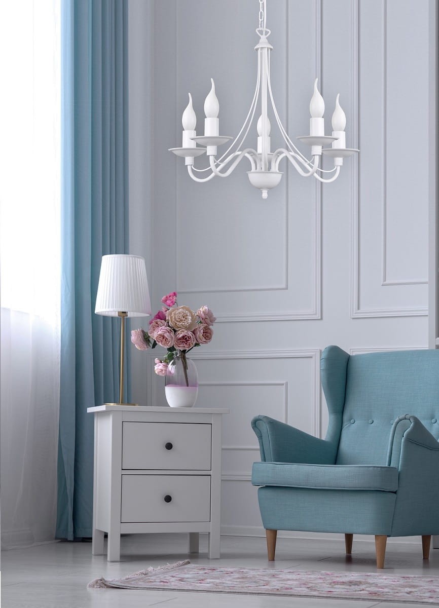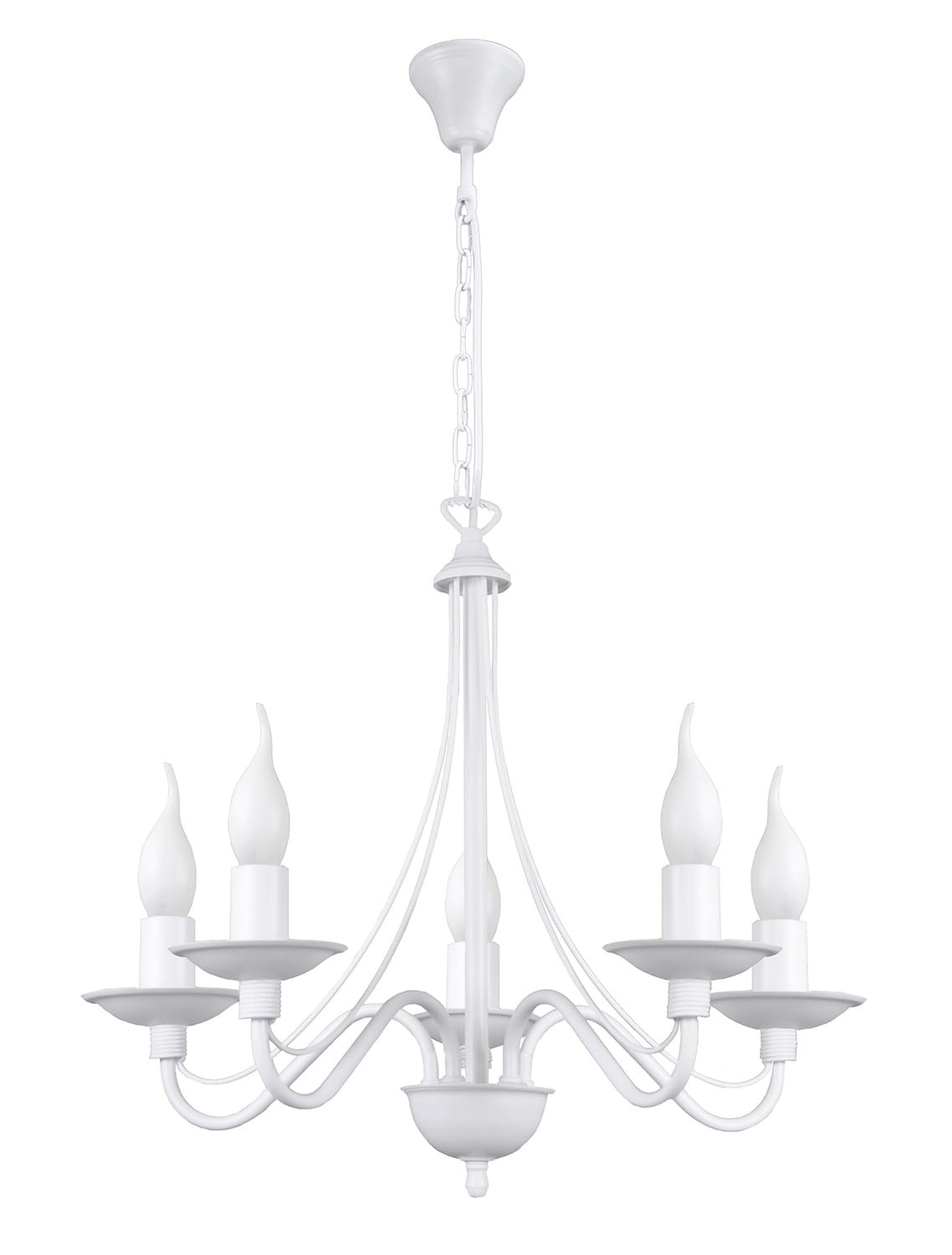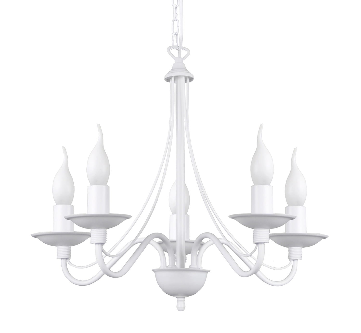 Piękny biały żyrandol świecznikowy. Lampa wisząca, która zachwyca delikatną formą i starannością wykonania. Żyrandol 5-ramienny nawiązuje do modnego stylu prowansalskiego i zachwycająco prezentuje się w towarzystwie jasnych mebli i naturalnych dodatków. Stylowa lampa sufitowa wniesie do wnętrza niepowtarzalny blask i będzie prawdziwą ozdobą. Jako idealne uzupełnienie lampy polecamy żarówki imitujące płomień świecy.