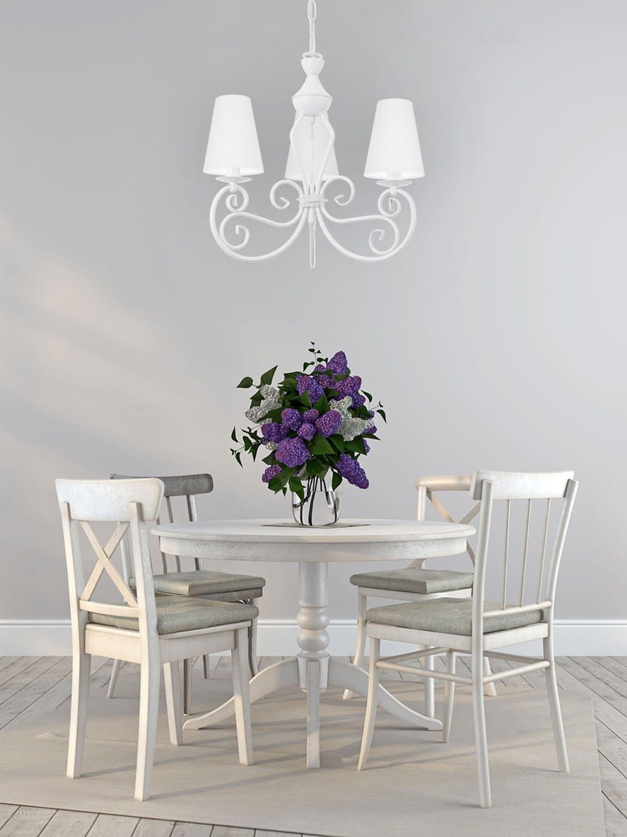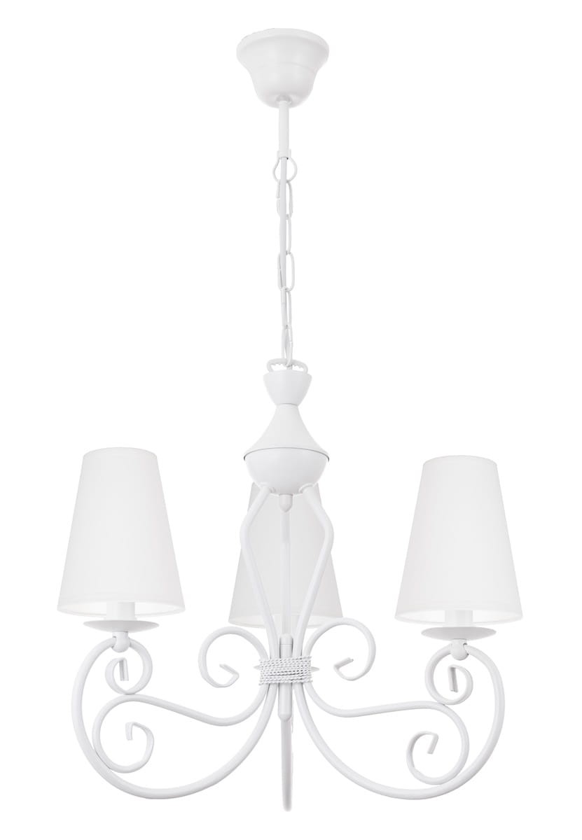 Biały żyrandol do salonu DALIA 3-płomienny, to piękny, ponadczasowy model dedykowany do klasycznych wnętrz. Żyrandol o pięknych ramionach składających się z finezyjnie wygiętych rureczek, które zostały wykończone uniwersalnymi, białymi abażurkami. Możesz też dla lepszego dopasowania lampy do swojego wnętrza zmienić tkaninę abażurów na dowolną z palety poniżej.
