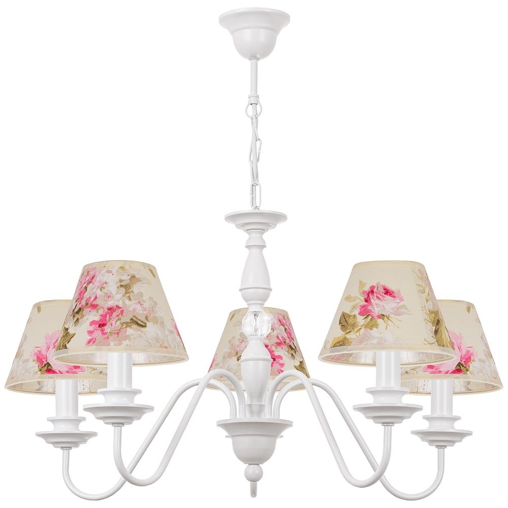 Biały żyrandol do sypialni KRISTAL. Ten piękny gustowny żyrandol z kwiatowymi abażurami nada oszałamiający wygląd każdej sypialni i nie tylko. Jego niesamowita uroda zachwyci również w salonie jak i pokoju dziecięcym. Jest to klasyczna linia lampy dodatkowo ozdobiona dużym kryształem odbijającym światło.