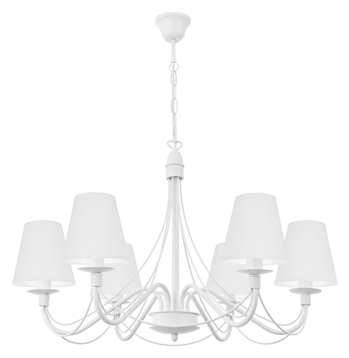 Biały żyrandol klasyczny do salonu. Klasyczny żyrandol ze smukłym stelażem wykończony uniwersalnymi, ponadczasowymi białymi abażurami doda każdemu wnętrzu wyjątkowej elegancji. Idealny do salonu, jadalni lub sypialni. Abażury wykonane z certyfikowanych materiałów.