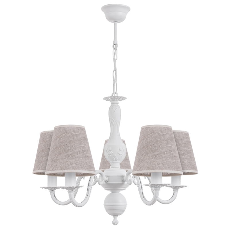 Biały żyrandol rustykalny do jadalni. Efektowny żyrandol z abażurkami z lnianej tkaniny. Klasyczny, bardzo dekoracyjny stelaż inspirowany stylistyką pałacową świetnie pasuje do zgrabnych abażurków. Żyrandol LALKA będzie doskonale prezentować się w klasycznie urządzonych wnętrzach jak jadalnie, salony, stylizowane kuchnie, świetnie komponuje się z bielą, gamą odcieni natury i surowym drewnem.