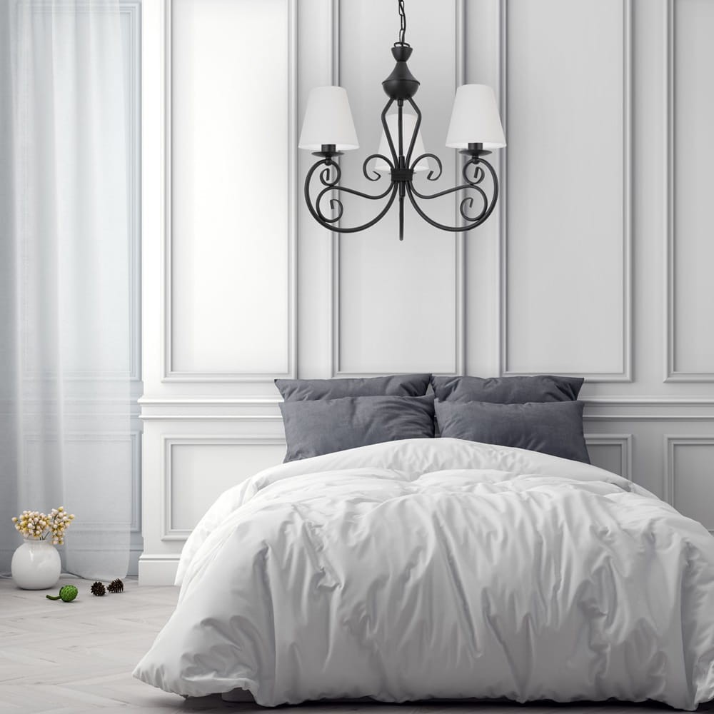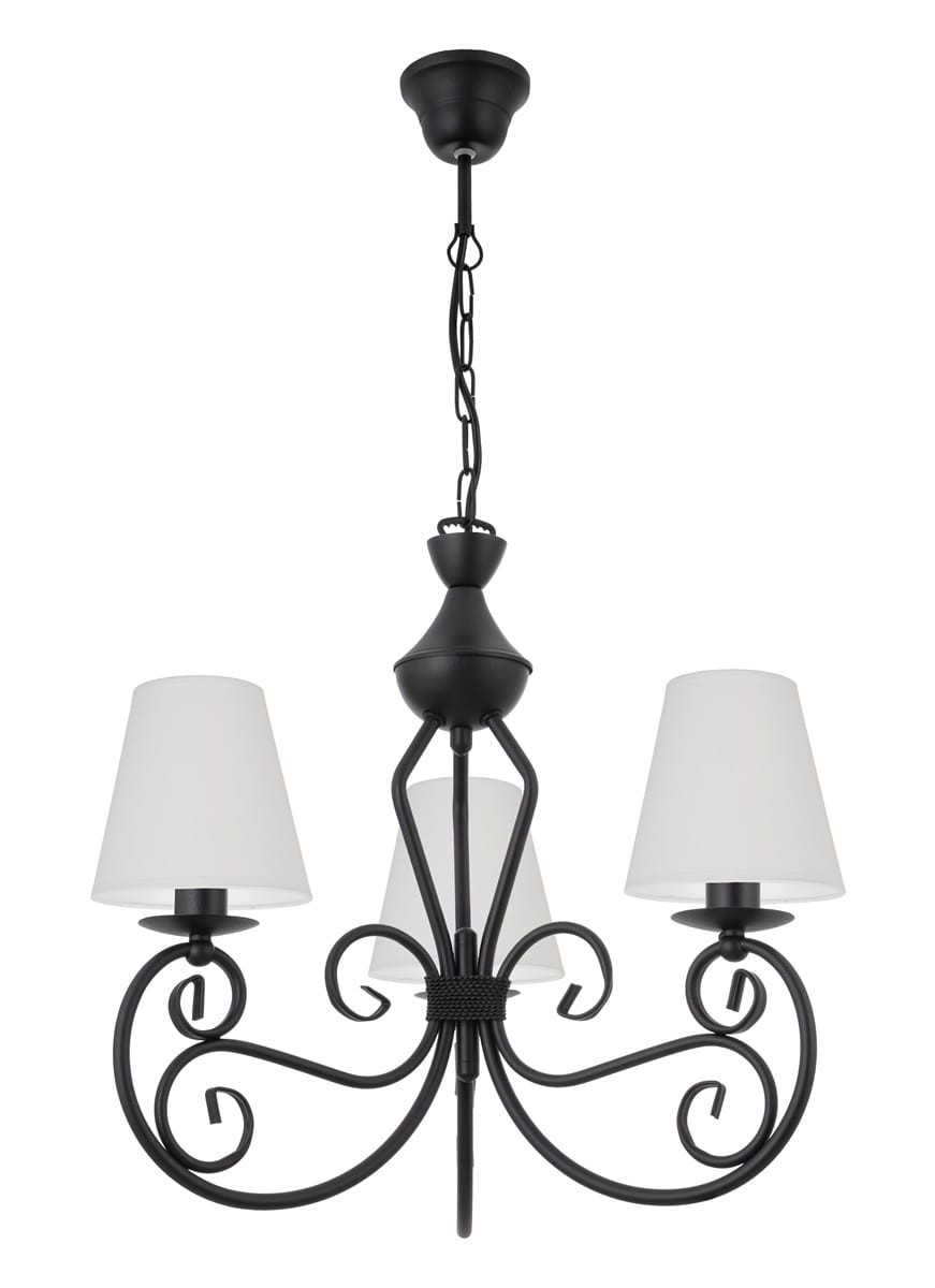 Czarna lampa wisząca z abażurami DALIA 3-płomienny, to piękna, ponadczasowa lampa z czarnym stelażem i białymi uniwersalnymi abażurkami wpasuje się idealnie w każde klasyczne wnętrze i nie tylko. Model dedykowany do niewielkich pomieszczeń w domu. Możesz też dla lepszego dopasowania lampy do swojego wnętrza zmienić tkaninę abażurów na dowolną z palety poniżej.