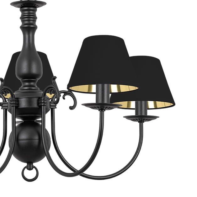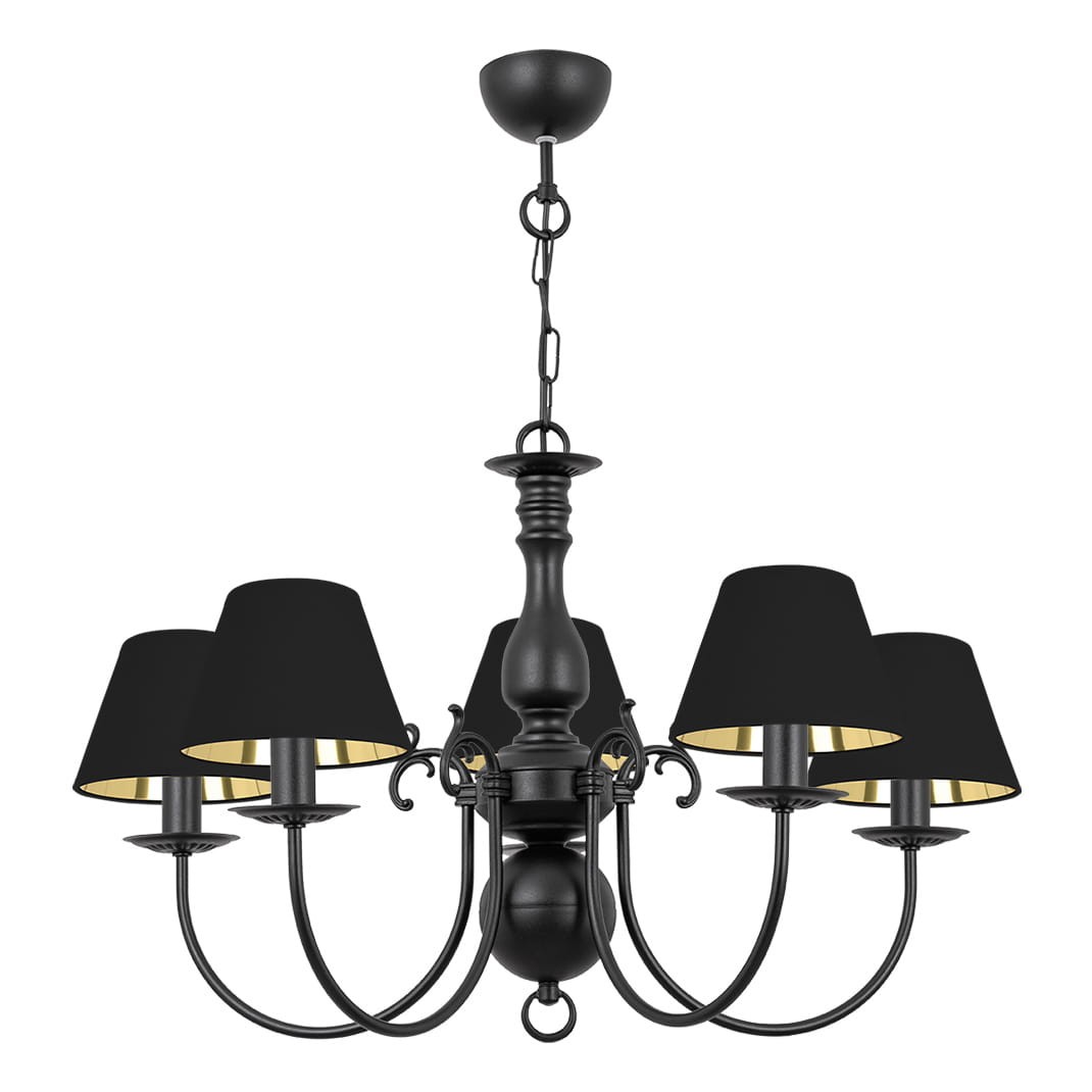 Czarna lampa z czarnymi abażurami MARIA CZARNA to stylowa lampa sufitowa z pięcioma ramionami, czarnym stelażem i abażurami w tym samym kolorze. Wnętrze kloszy wykończone jest błyszczącym złotem, które odbija światło i nadaje wnętrzu ciepły, elegancki blask. Głęboka czerń podkreśla klasyczny charakter lampy, dzięki czemu świetnie pasuje do tradycyjnych i eleganckich przestrzeni, takich jak salon, jadalnia czy hol.