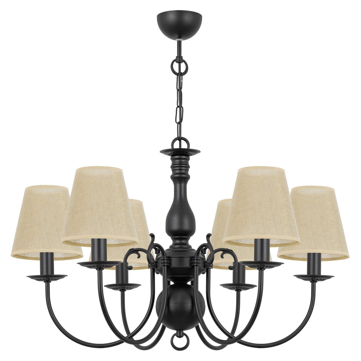 Czarna lampa z lnianymi abażurami MARIA CZARNA to stylowy żyrandol z czarnym stelażem i sześcioma ramionami, na których umieszczono abażury ze złotego lnu. Jej klasyczny wygląd wprowadza do wnętrza elegancję i ciepło. Zestawienie czerni z naturalnym kolorem abażurów sprawia, że lampa świetnie wygląda w salonie lub jadalni, dodając przytulnego charakteru.