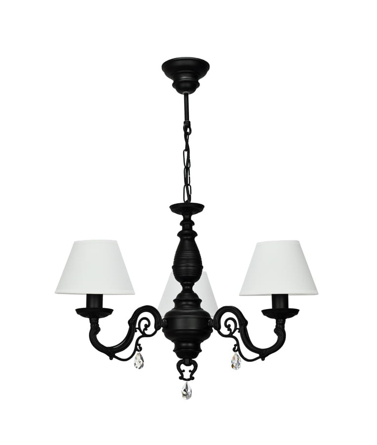 Czarno-biała lampa wisząca z kryształkami. Elegancki żyrandol 3-ramienny łączy dekoracyjny czarny stelaż i zgrabne białe abażury z tkaniny, całość zdobią błyszczące kryształki. Klasyczny żyrandol, kształtem przypomina dawne modele pałacowe, filigranowe ramiona dodają lampie lekkości, abażurki świetnie komponują się z całością.