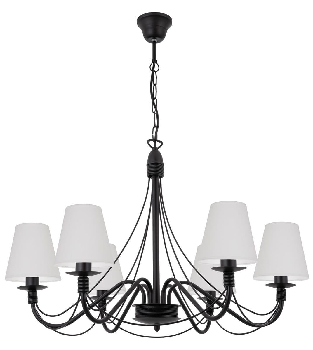 Czarno-biały żyrandol do salonu. Klasyczny 6-ramienny żyrandol ze smukłym stelażem wykończony uniwersalnymi, ponadczasowymi białymi abażurami doda każdemu wnętrzu wyjątkowej elegancji. Idealny do salonu, jadalni lub sypialni. Abażury wykonane z certyfikowanych materiałów.