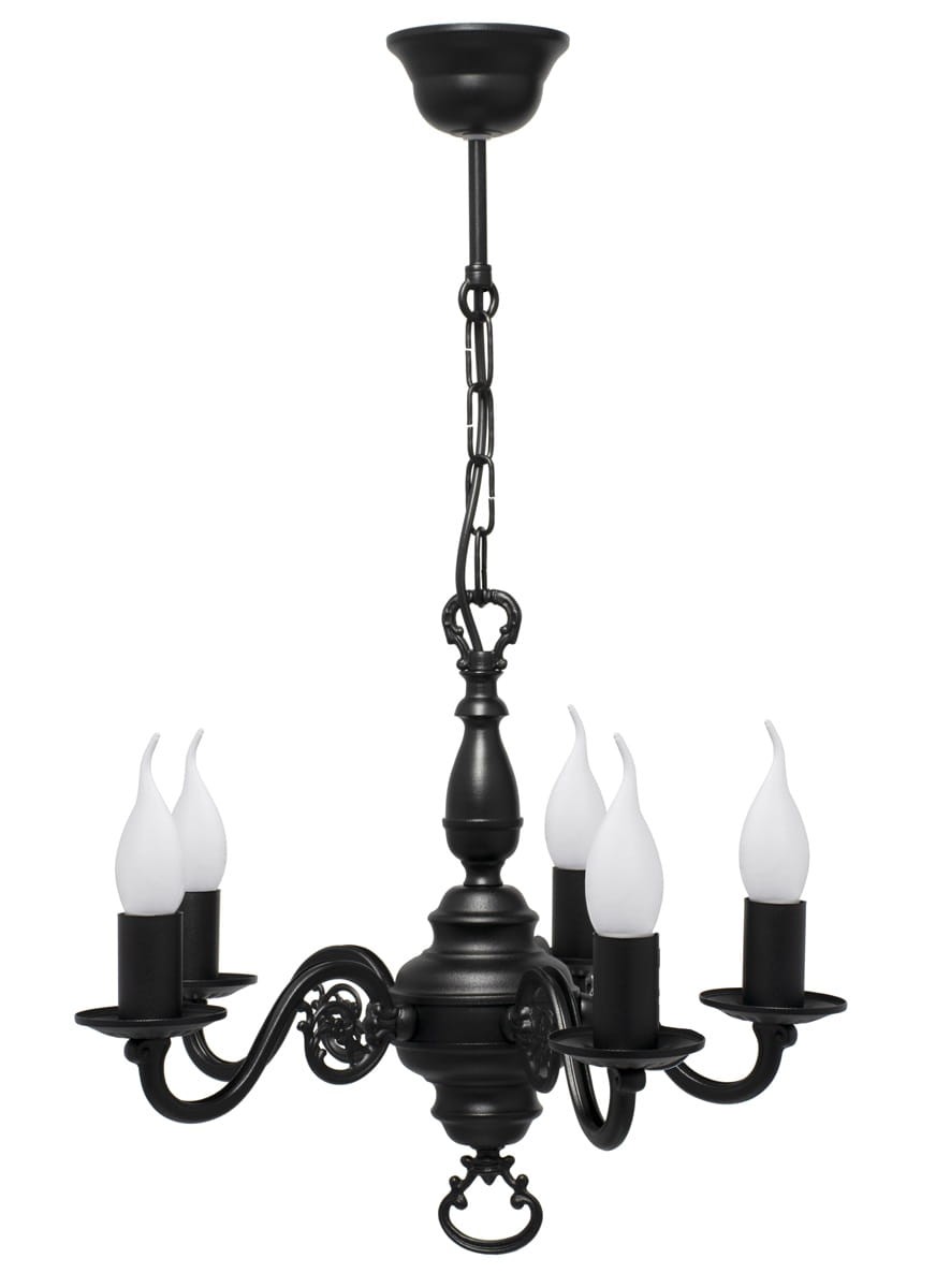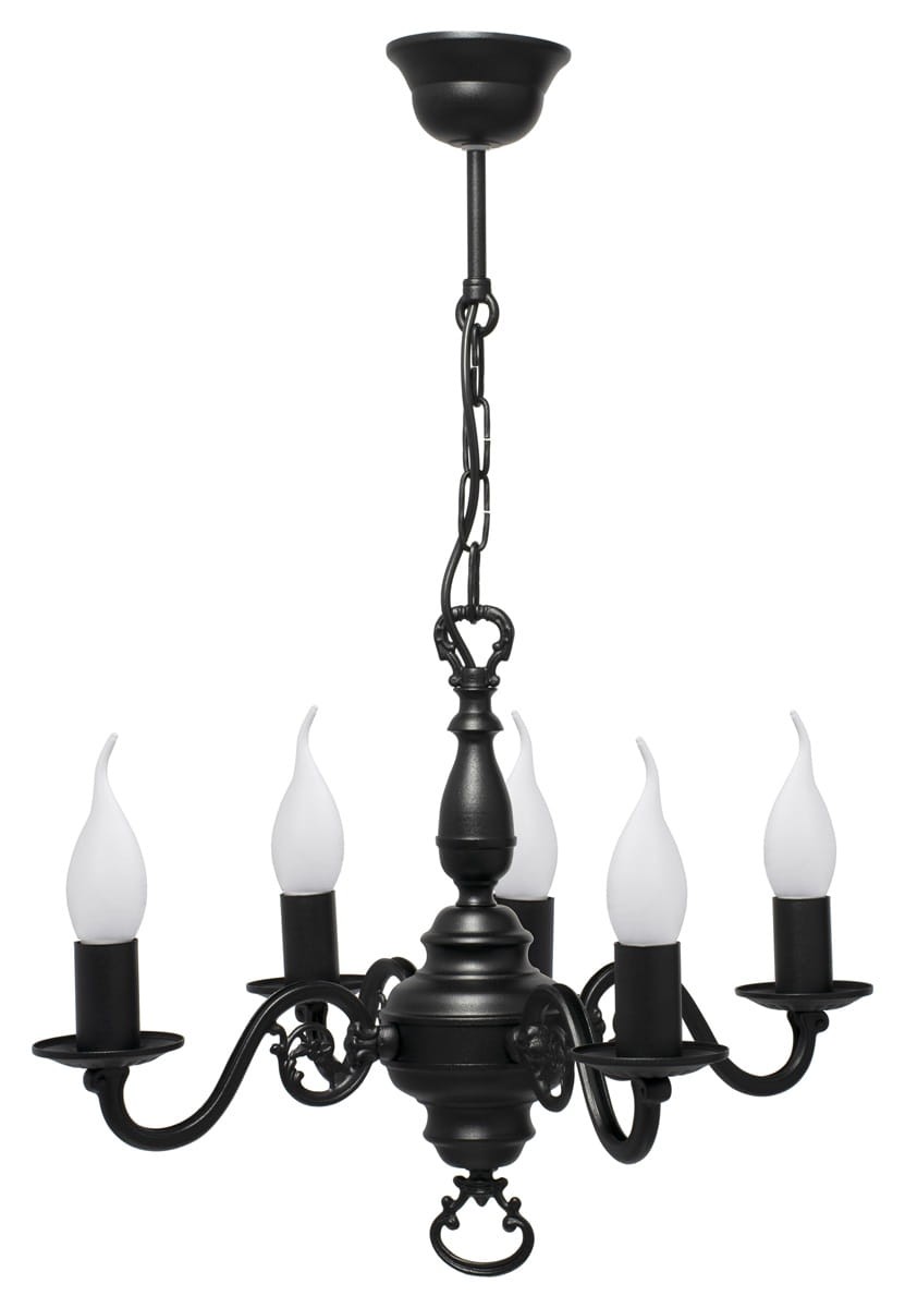 Stylizowany i zdobny czarny 5-ramienny żyrandol świecznikowy. Pasuje do wnętrz w stylu klasycznym, zamkowym lub shabby chic. Idealny do zawieszenia w centralnym miejscu w pomieszczeniu.