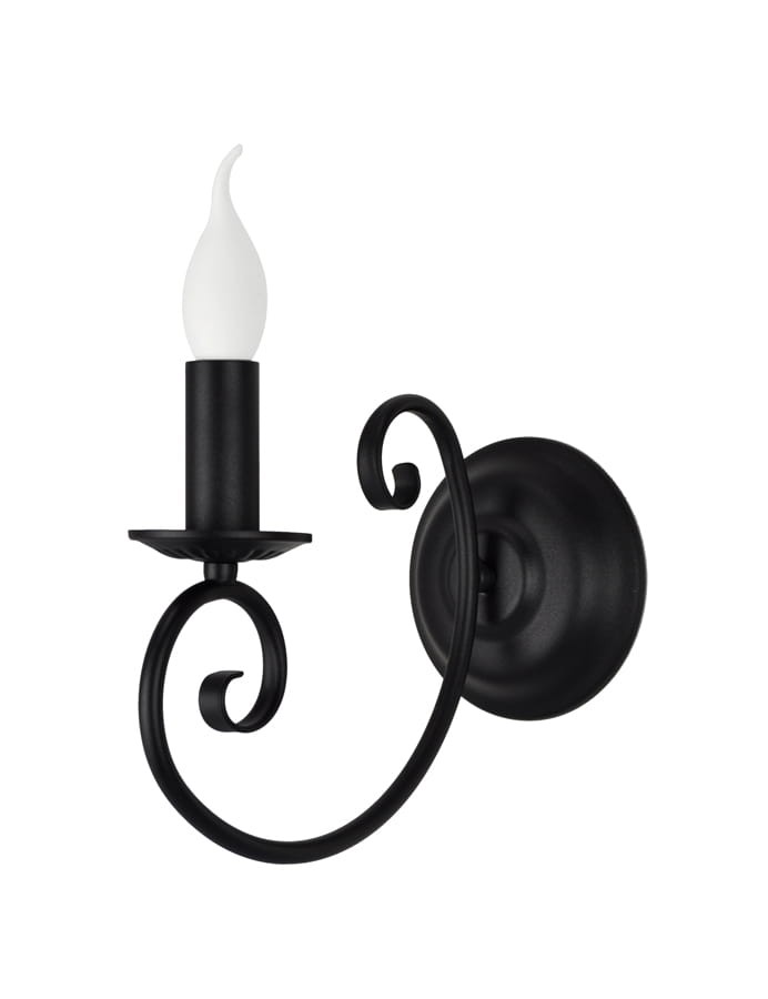 Czarny kinkiet świecznikowy w klasycznym stylu. Niewielki lecz bardzo elegancki kinkiet do sypialni lub przedpokoju, z ozdobną żarówką imitującą płomień świecy prezentuje się zachwycająco. Kinkiet idealnie pasuje do naszych żyrandoli z serii DOMINO, w komplecie nasze lampy wyglądają znakomicie.