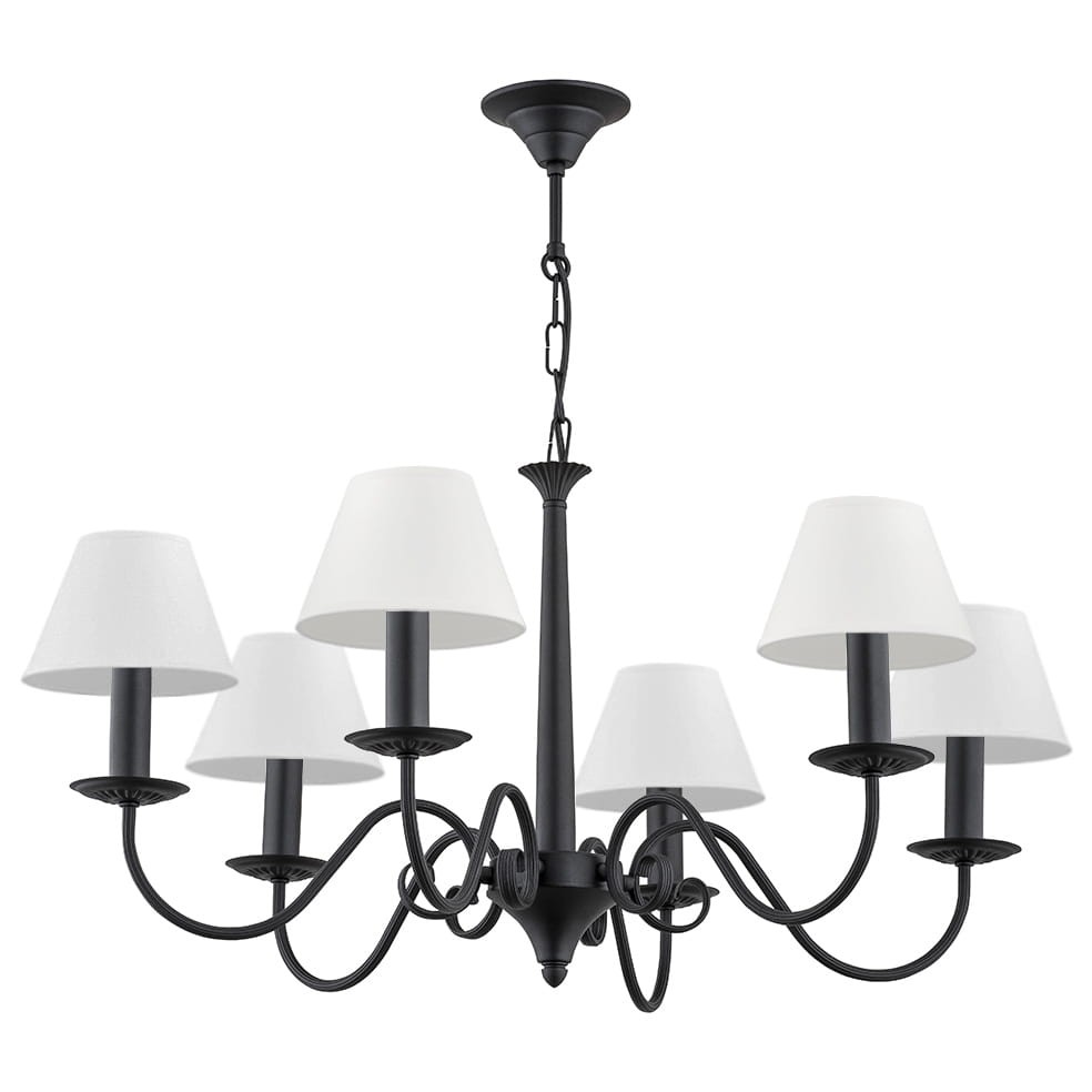 Czarny klasyczny żyrandol 6-ramienny to model idealny do pokoju dziennego lub przestronnych wnętrz w eleganckim stylu. Kontrastujące ze stelażem abażurki zostały wykonane z wysokiej jakości, certyfikowanej tkaniny. Wyprodukowano w Polsce.